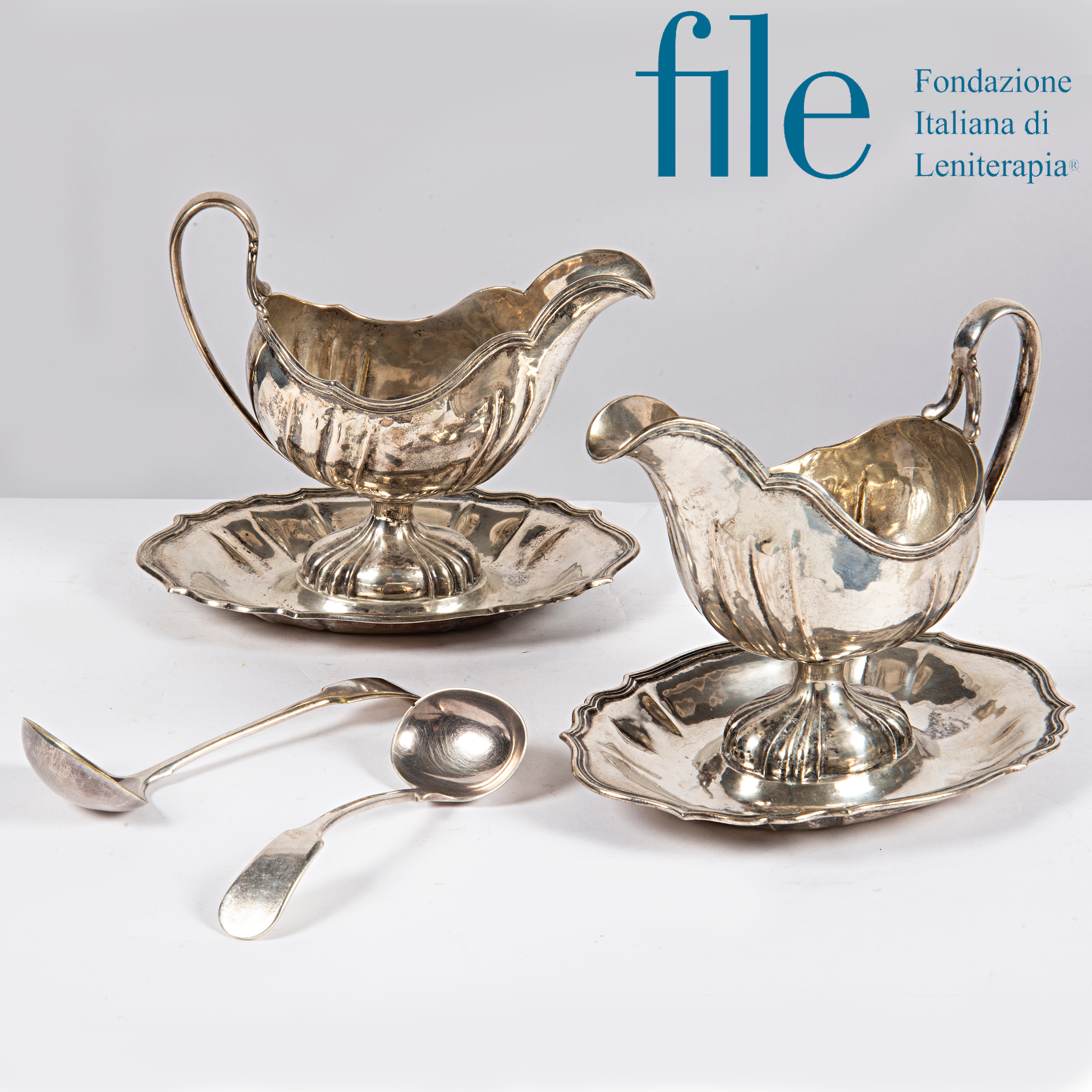 in argento, bordo sagomato e scanalato, vassoietti ovali mistilinei, prese a voluta, alt. cm 21, lungh. cm 23, complessivi g 1550