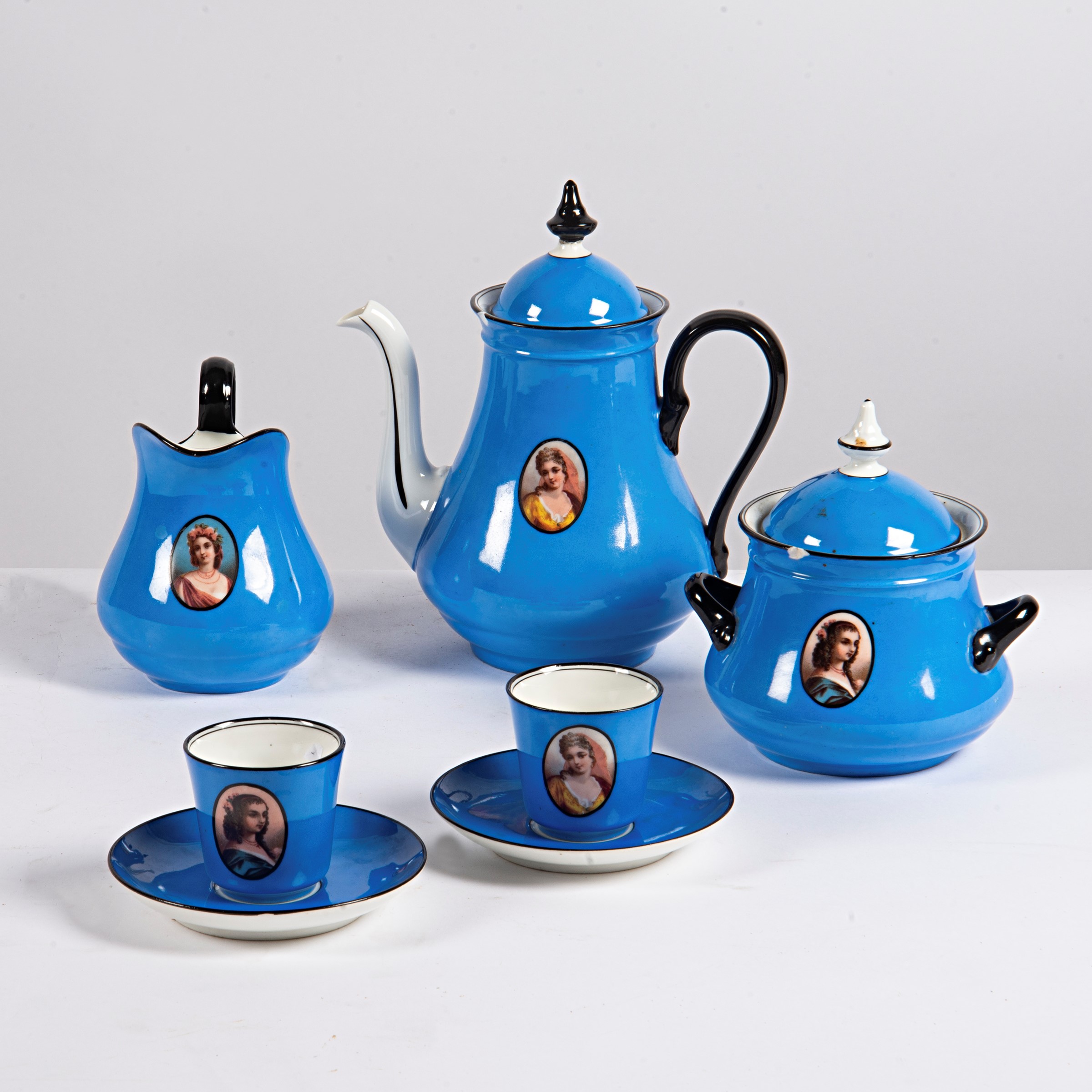 in porcellana azzurra con rigo oro e medaglioni a busti femminili, composto da caffettiera, lattiera, zuccheriera, nove tazze e dodici piattini, difetti