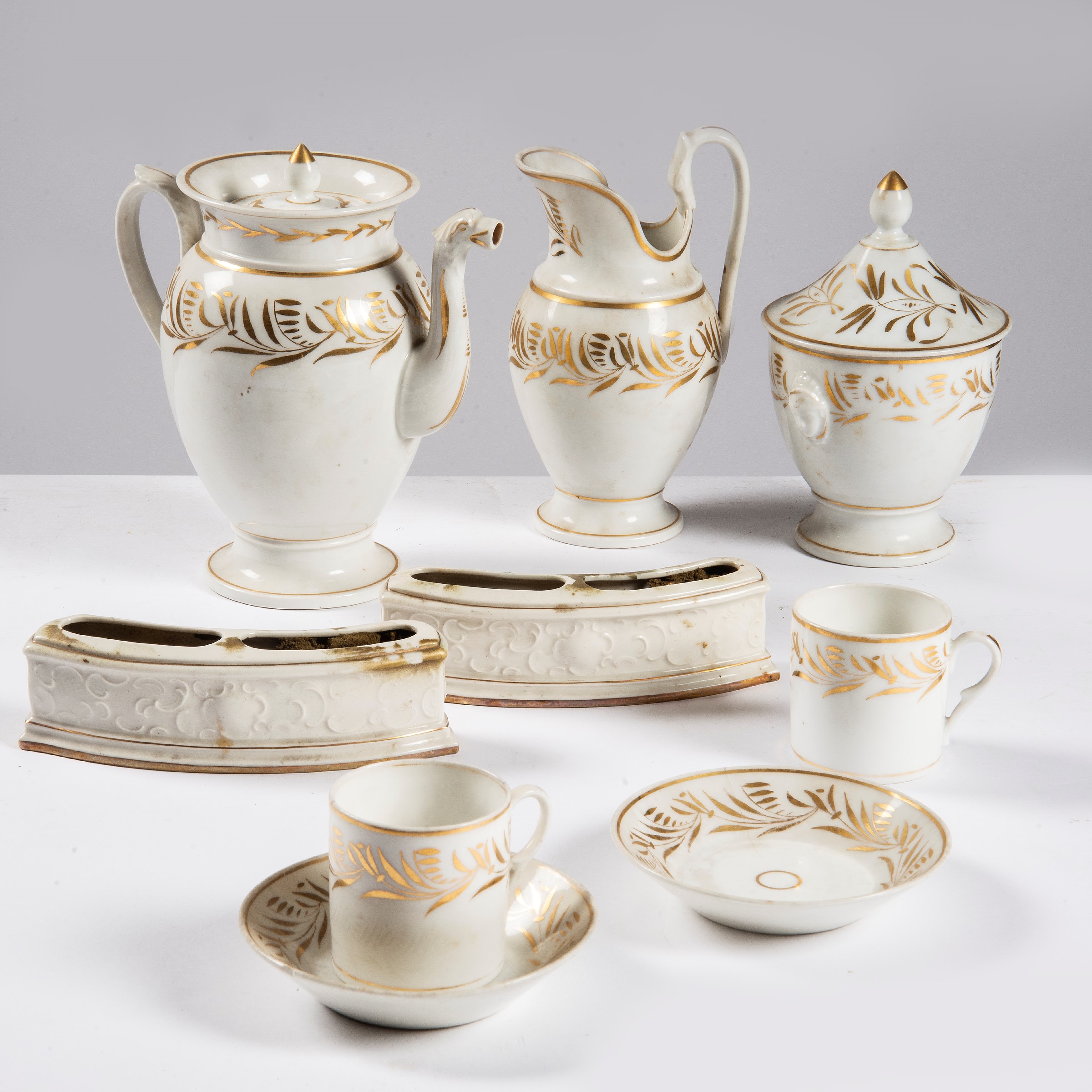 in porcellana bianco-oro, composto di lattiera, zuccheriera, caffettiera, nove tazze e nove piatti, difetti