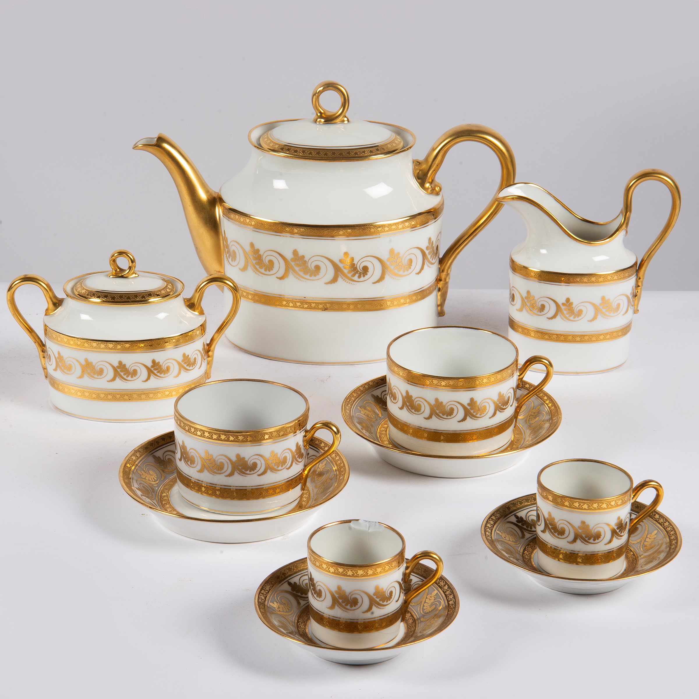 in porcellana bianca, rigo oro e fascia decorata a volute, composto da: teiera, lattiera, zuccheriera, dodici tazze da tè con piattini e dodici tazze da caffè con piattini, una tazza sbocconcellata