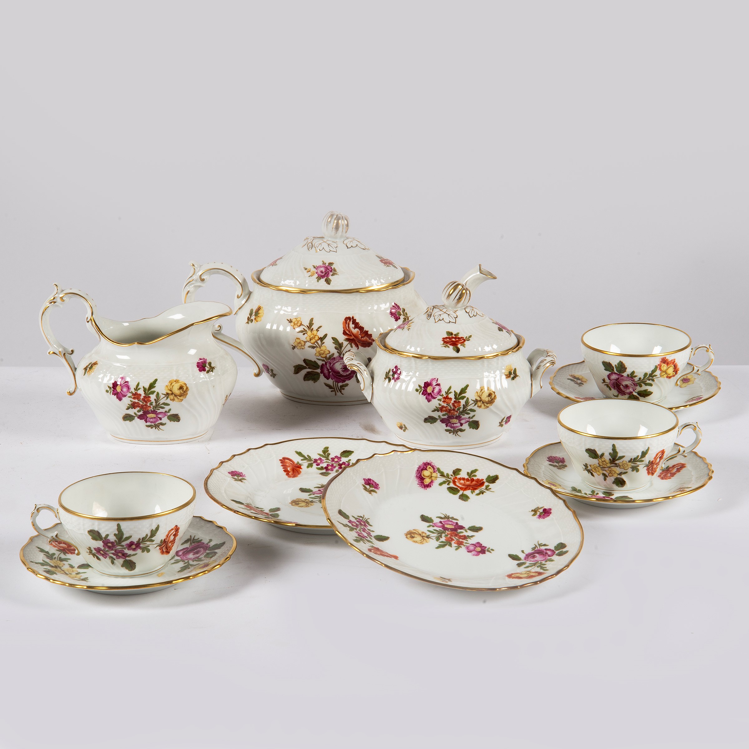 in porcellana bianco-oro con decorazioni a fiori, composto da: teiera, lattiera, zuccheriera, tredici tazze, dodici piattini, quattordici piatttini da dessert