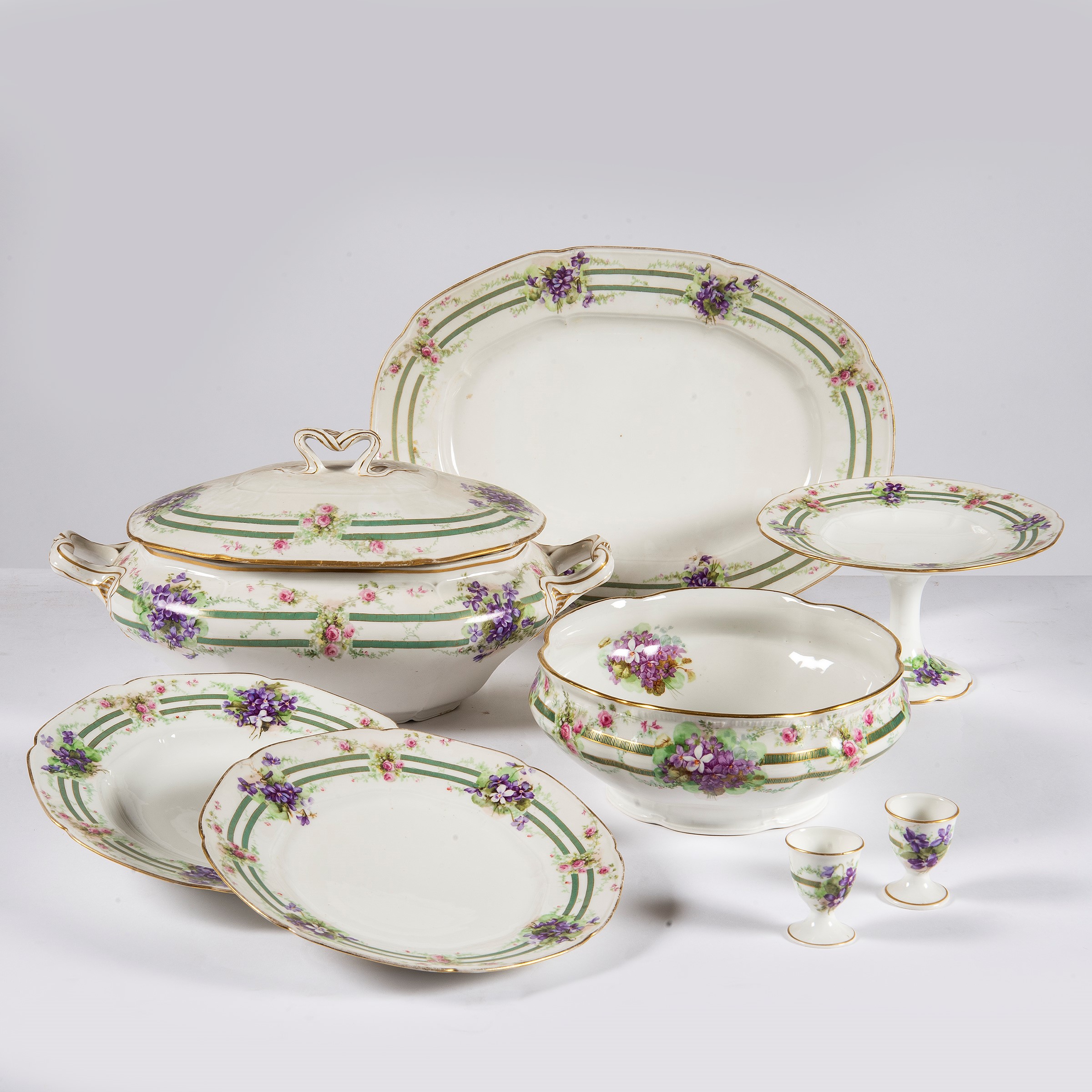 in porcellana bianca con decoro a violette composto di quarantacinque pezzi, difetti