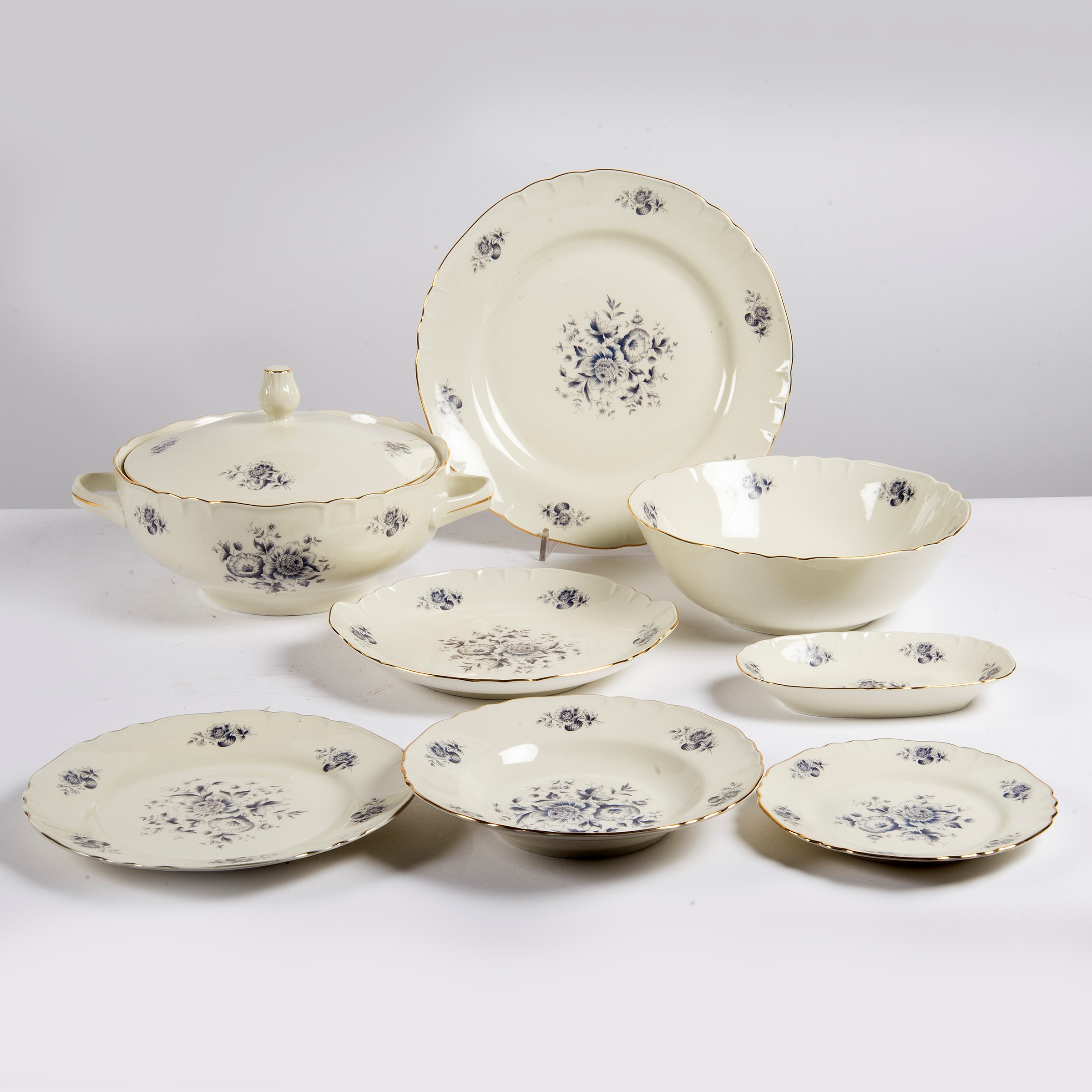 Composizione: 21 piatti piani, 11 piatti fondi, 12 piattini da dessert, 3 vassoi ovali, 3 vassoi circolare, 1 zuppiera, 1 insalatiera, 2 raviere