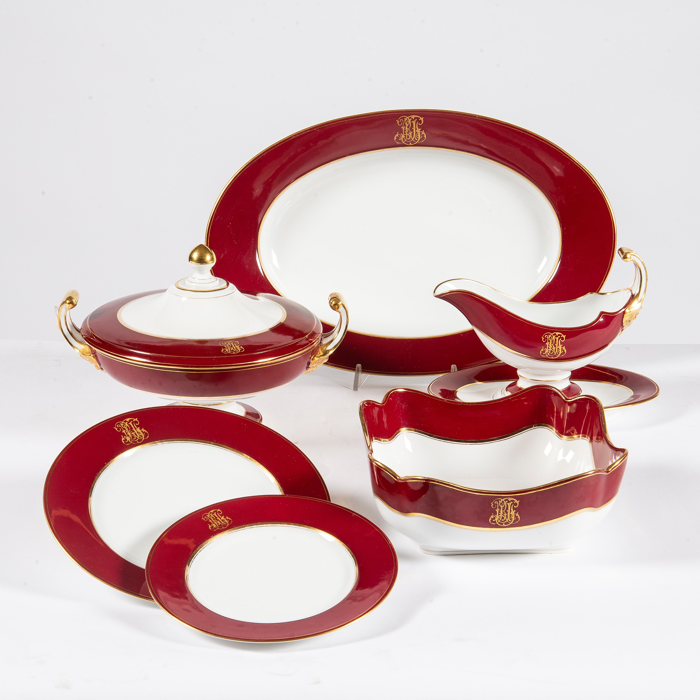 in porcellana bianca con tese rosse e oro decorate da monogramma composto di novantatre pezzi
