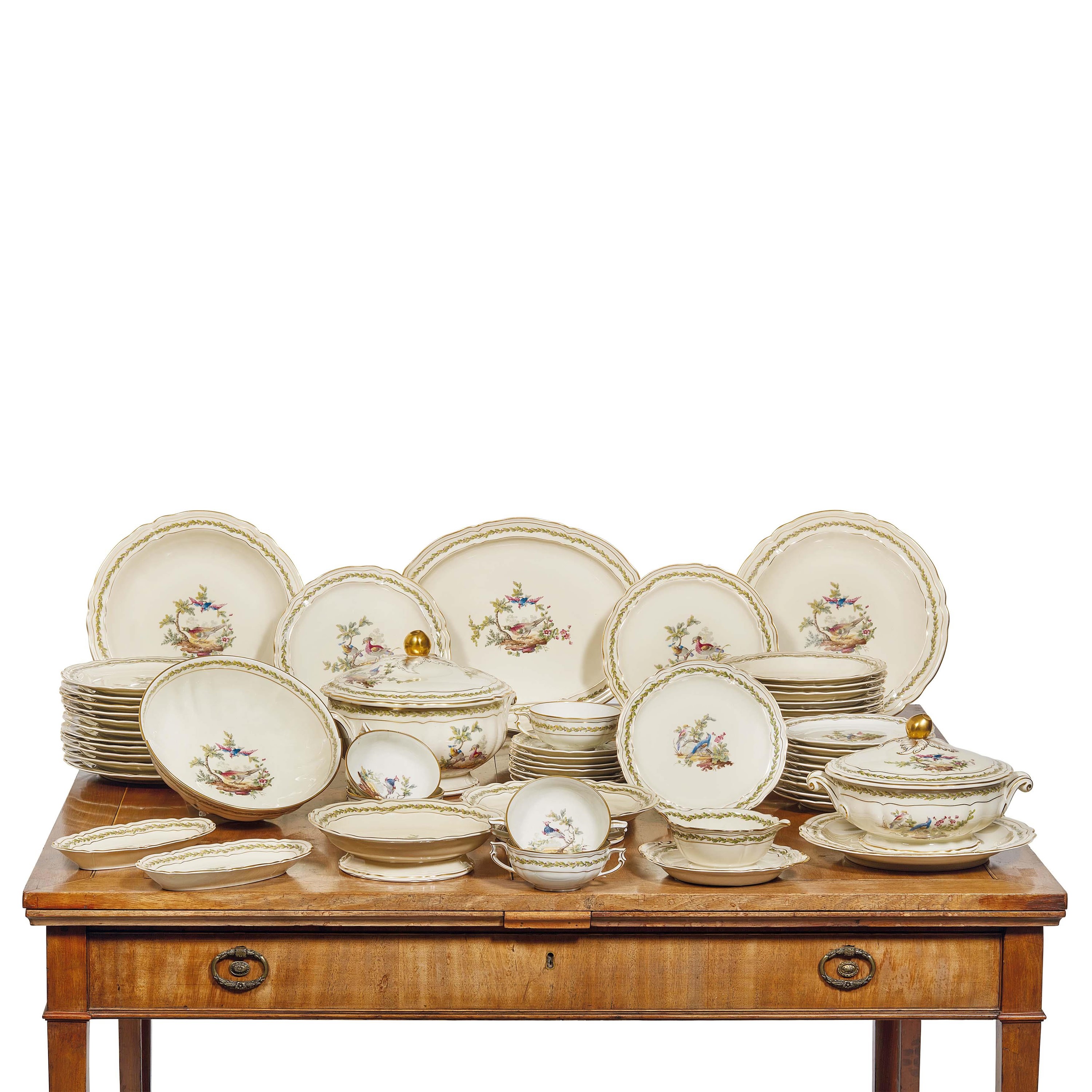 Composizione: 36 piatti piani, 16 piatti fondi, 24 piatti da dessert, 9 tazze, 12 piattini, 1 grande zuppiera con coperchio, 1 zuppiera con coperchio, 3 alzatine, 1 grande vassoio ovale, 2 piccoli vassoi ovali, 2 grandi vassoi circolari, 1 vassoio circolare fondo, 1 insalatiera, 1 salsiera.