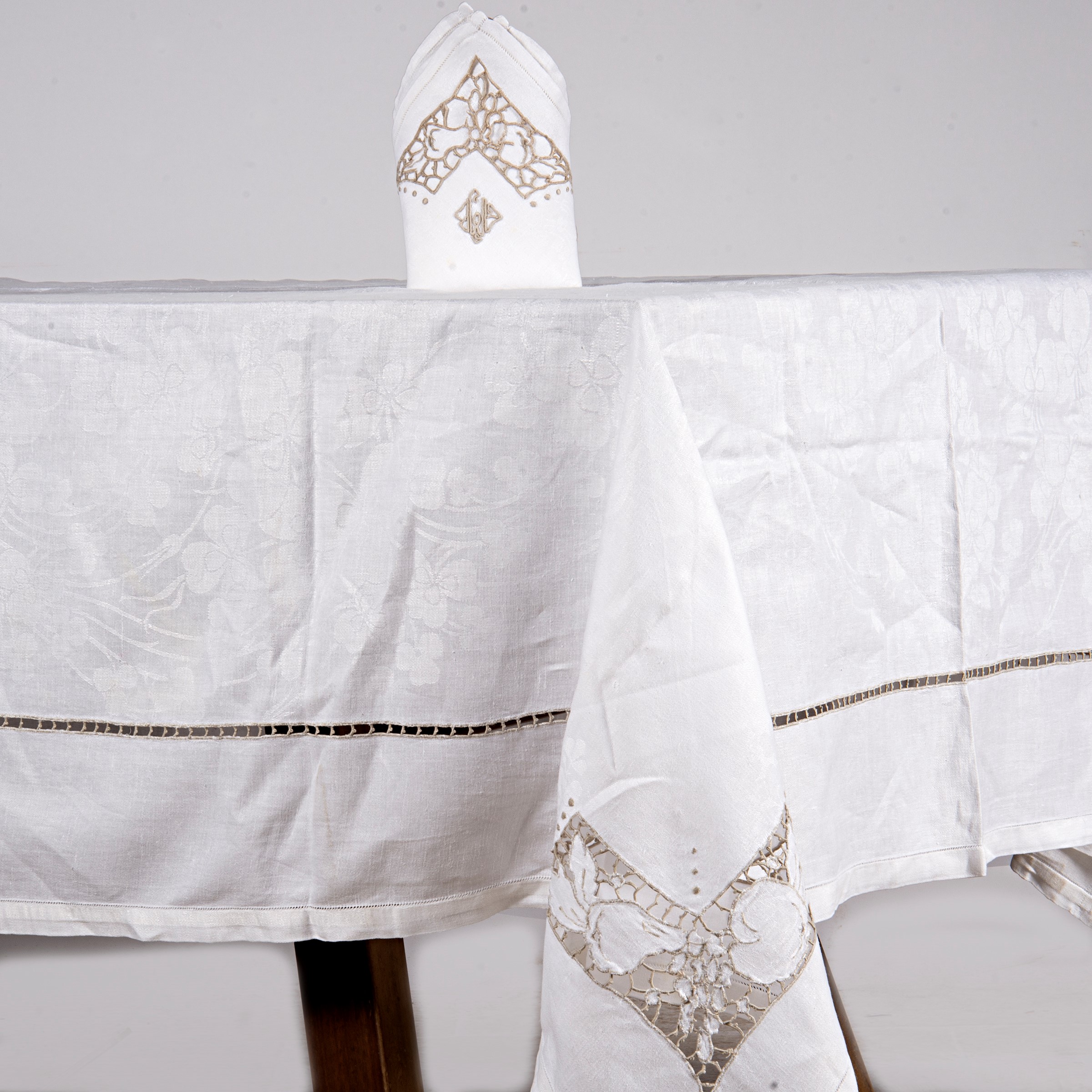 in cotone ricamato, cm 288x160, con dodici tovaglioli