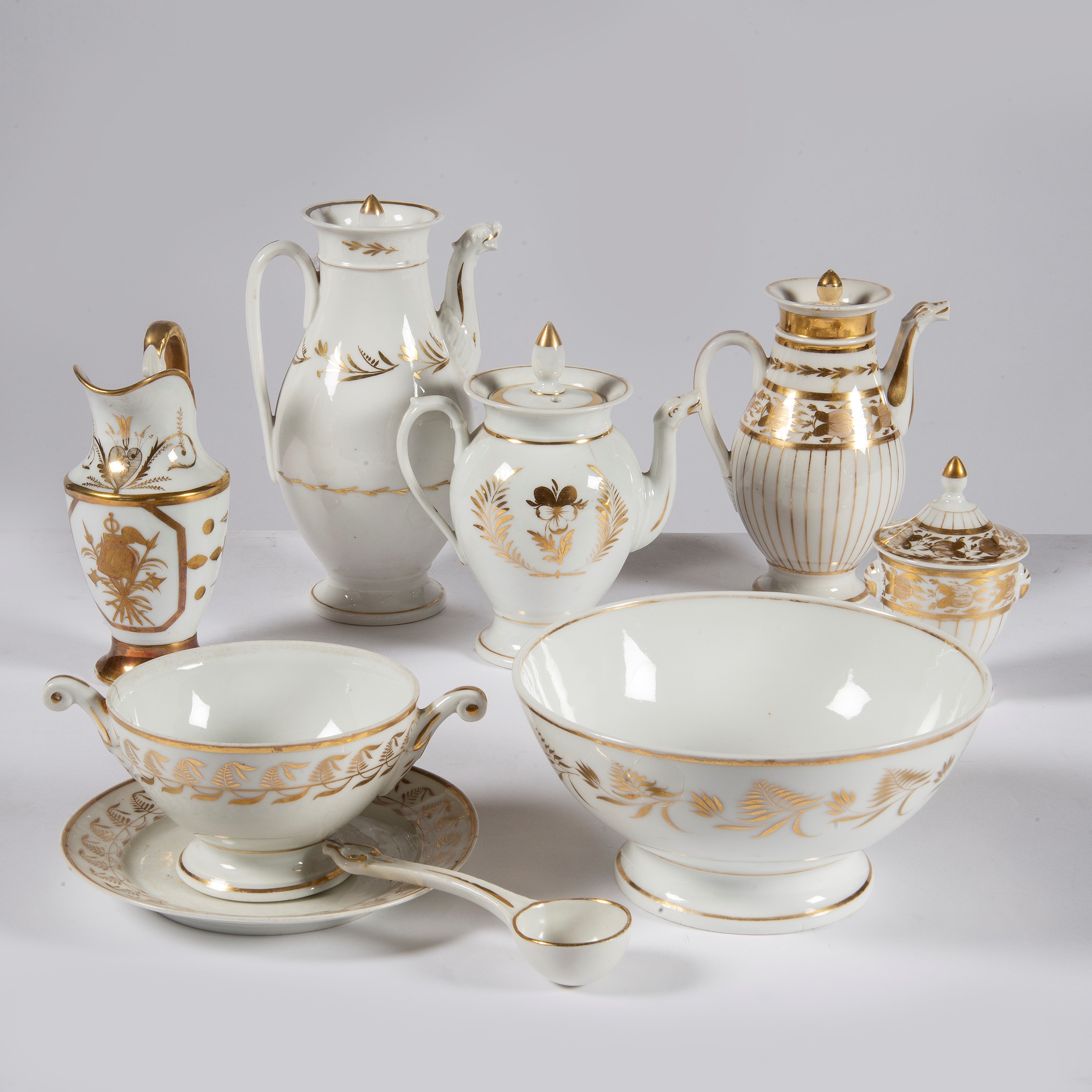 Tre caffettiere, un versatoio, una bowl, una coppetta biansata con piattino, una zuccheriera, sec. XX