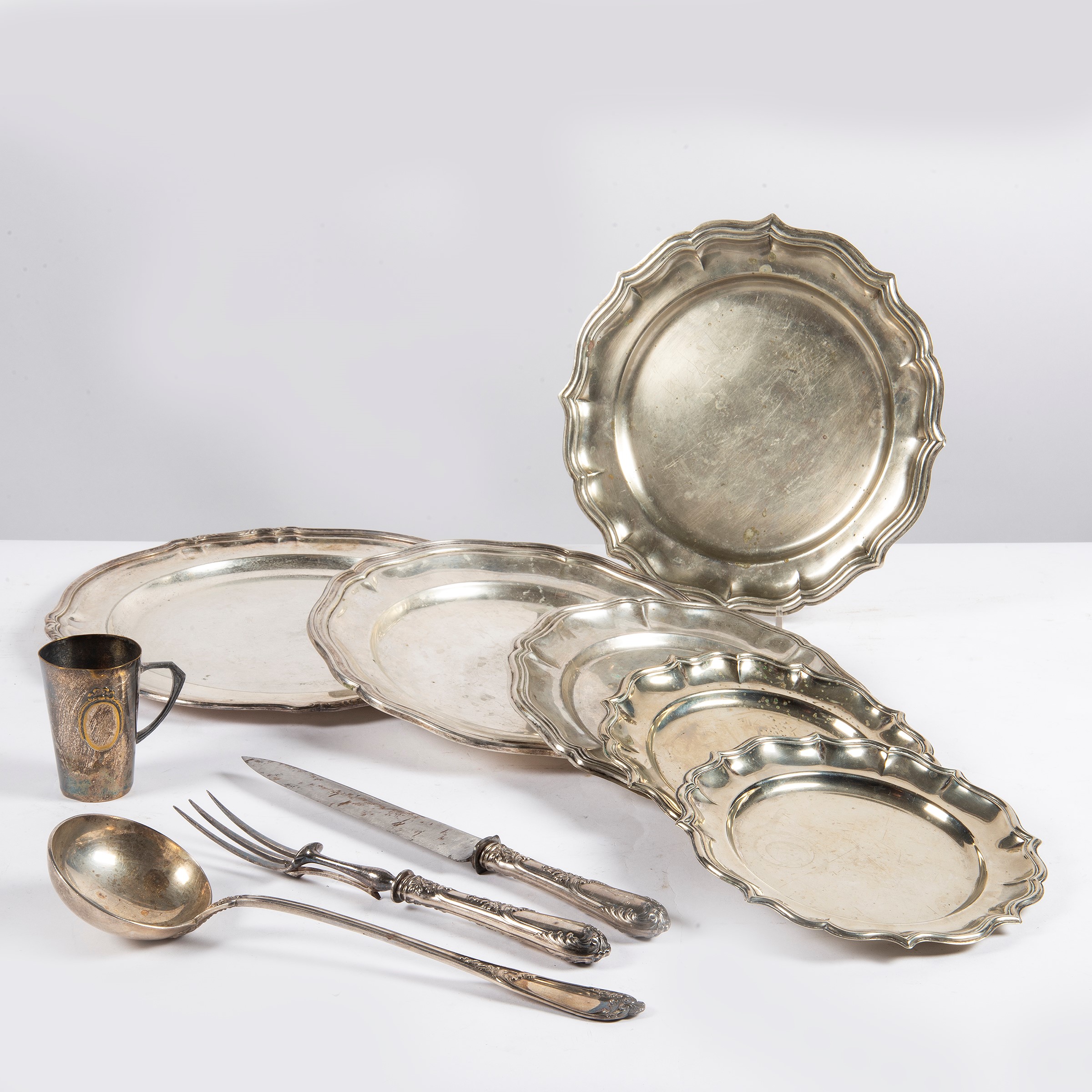 Un forchettone, un coltellone, un bicchierino con manico e quattro vassoietti in metallo argentato