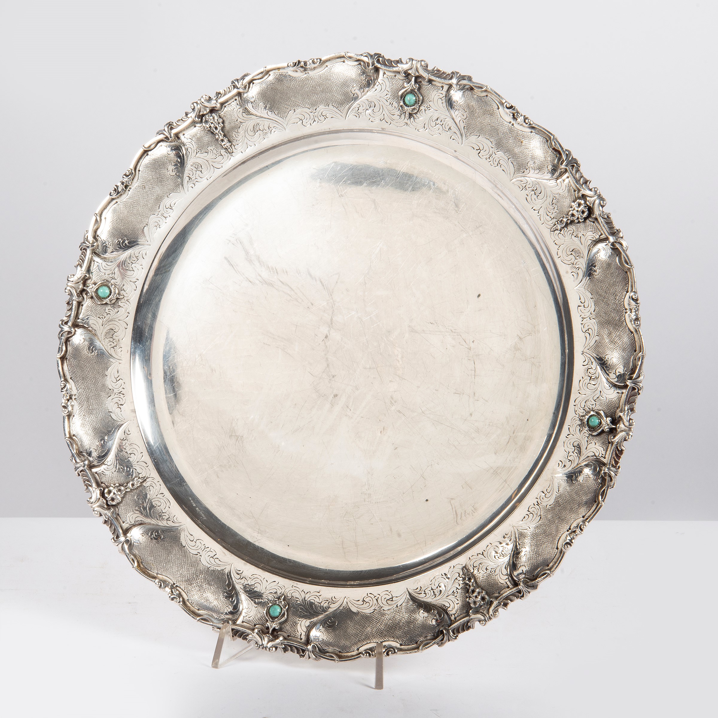 in argento, di forma circolare, tesa incisa a volute e pietre di turchese, diam. cm 38, g 1000, punzoni 800 e del fabbricante 3VC