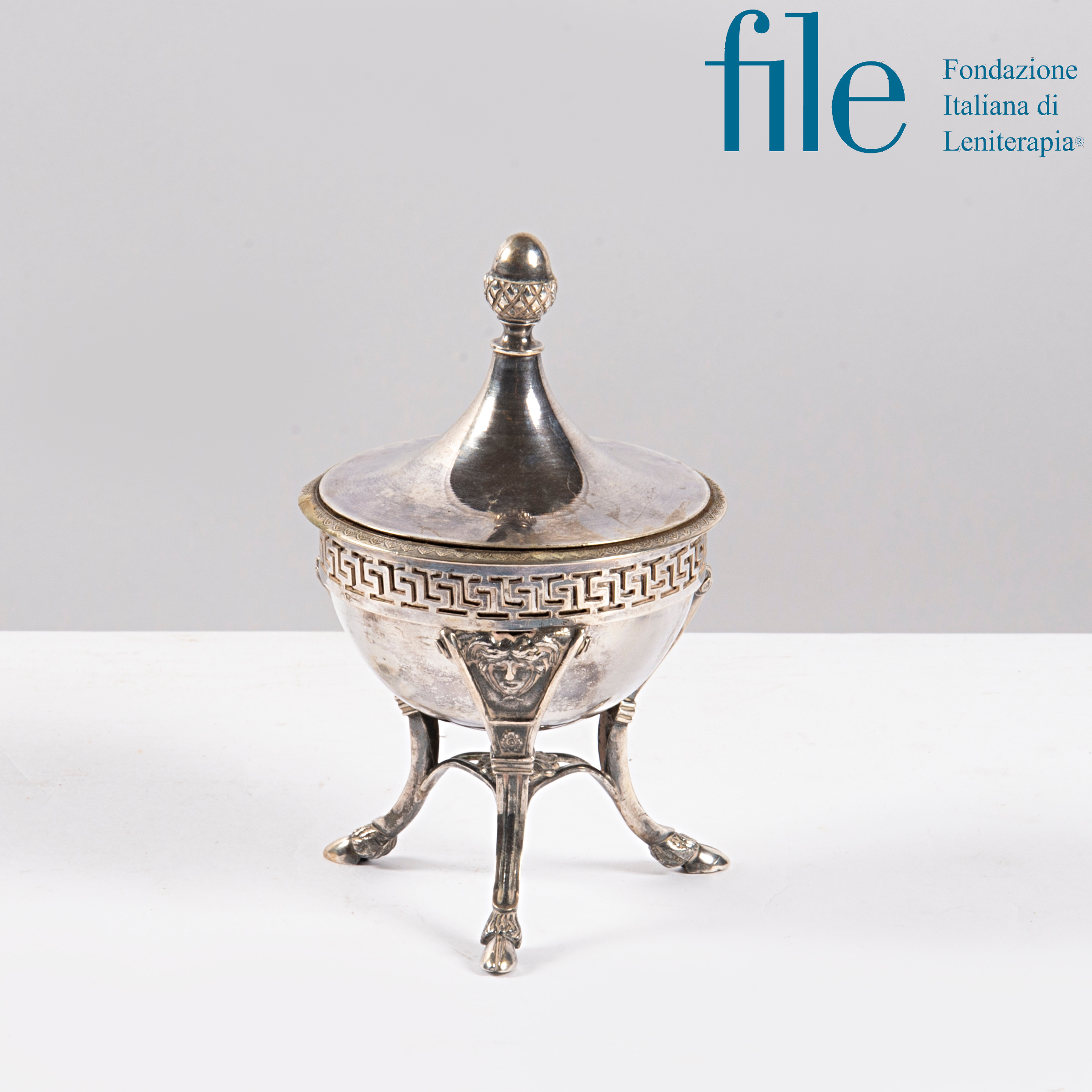 in argento, coppa estraibile, supporto a triode con fascia greca traforata, teste alate, terminanti a zoccolo, alt. cm 15, g 300