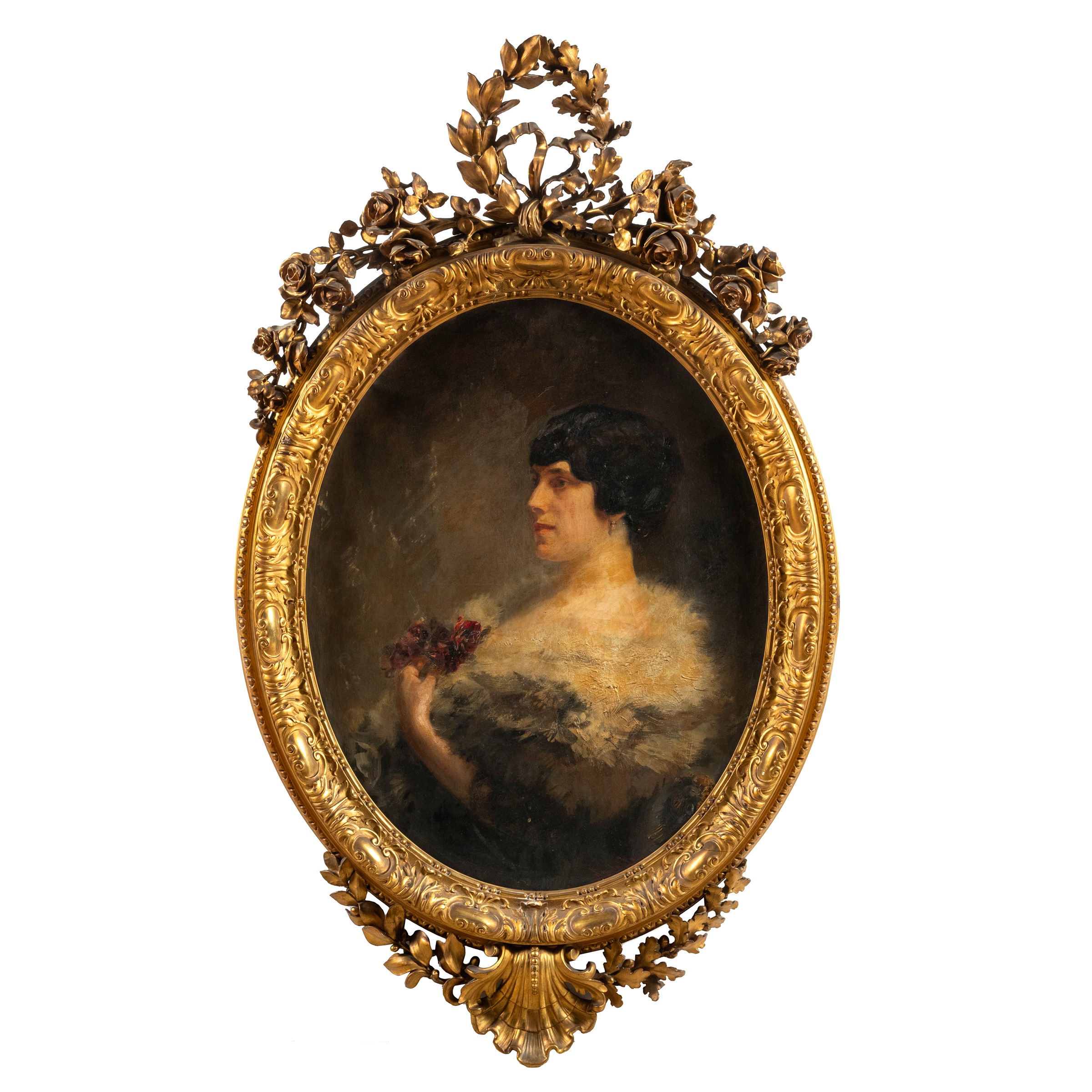 olio su tela ovale, indistintamente firmato in basso a destra, datato 1914, entro cornice riccamente intagliata, cm H90xL70