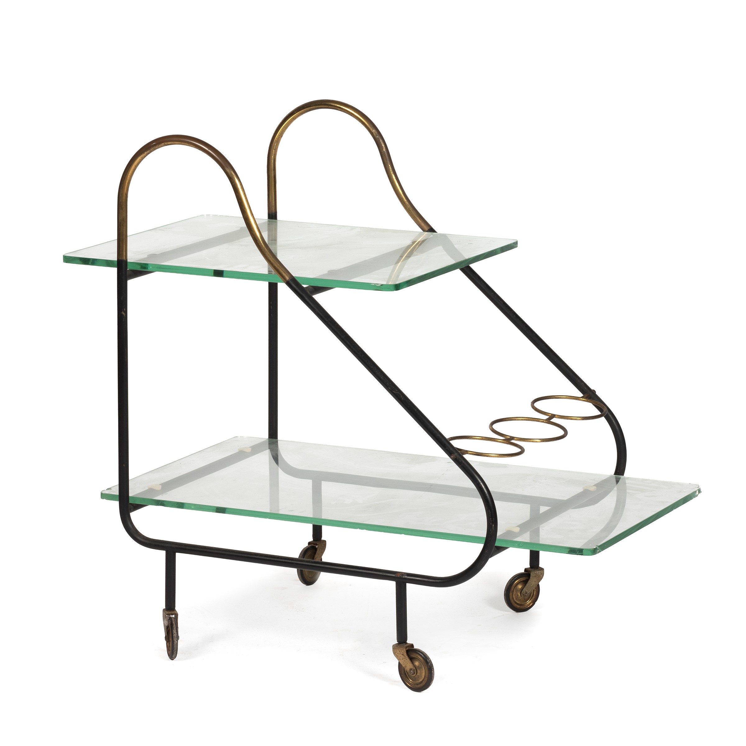 in ferro sagomato, con due piani in vetro, maniglie e portabottiglie in ottone, su ruote, cm L72xP43xH70