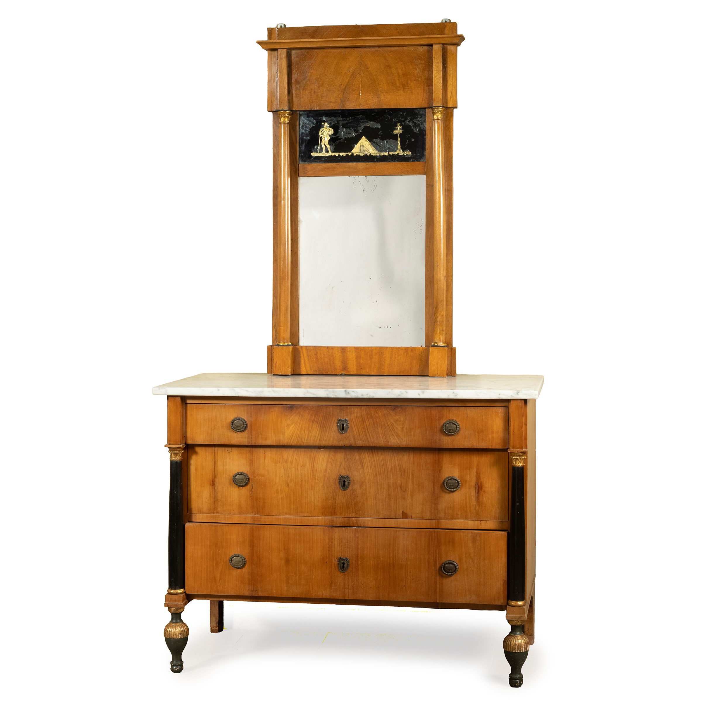 lastronato in noce biondo, piano in marmo, fronte a tre cassetti tra colonne ebanizzate desinenti in capitelli dorati, piede piriforme, cm L123xP59,5xH93,5
