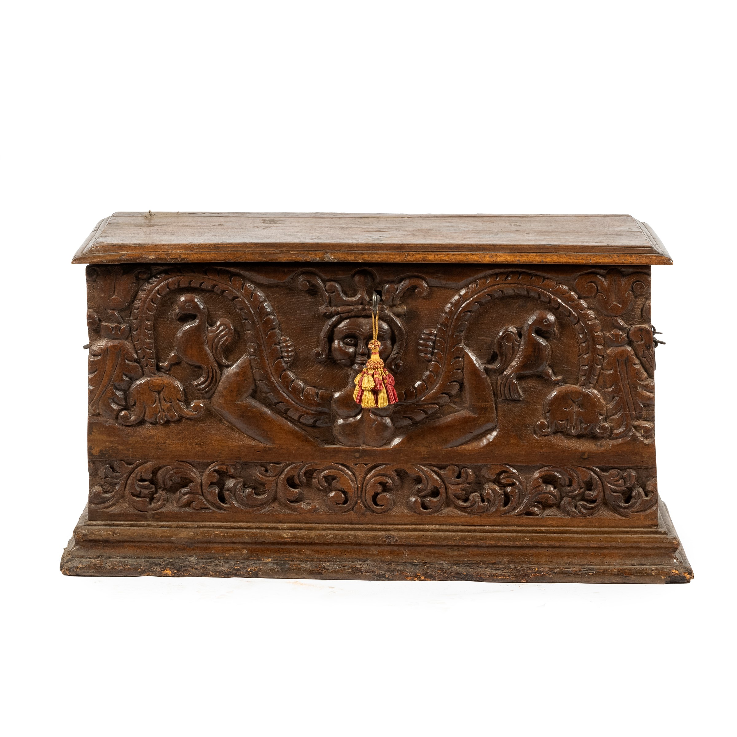 in noce con fronte intagliato, maniglie in ferro battuto, cm L91xP42xH50