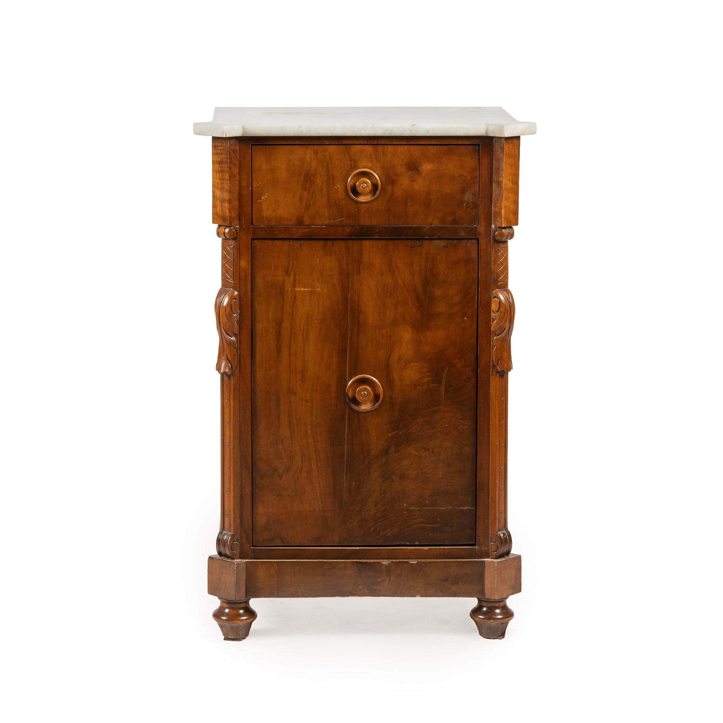 in noce a un cassetto e a uno sportello, piano in marmo, laterali intagliati, cm L56xP42xH86