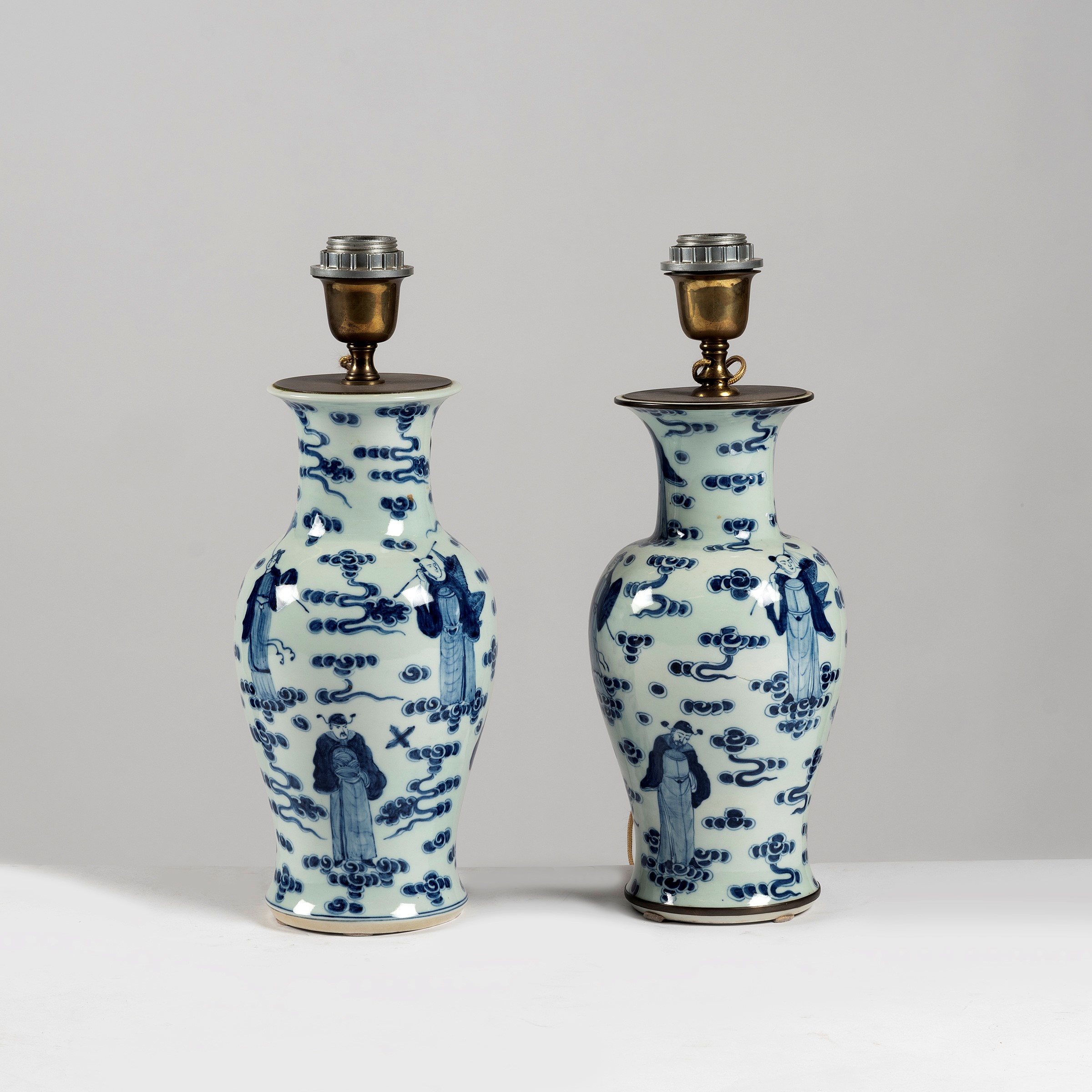 in porcellana bianco blu, con decori di dignitari, montati a lampada, alt. cm 30