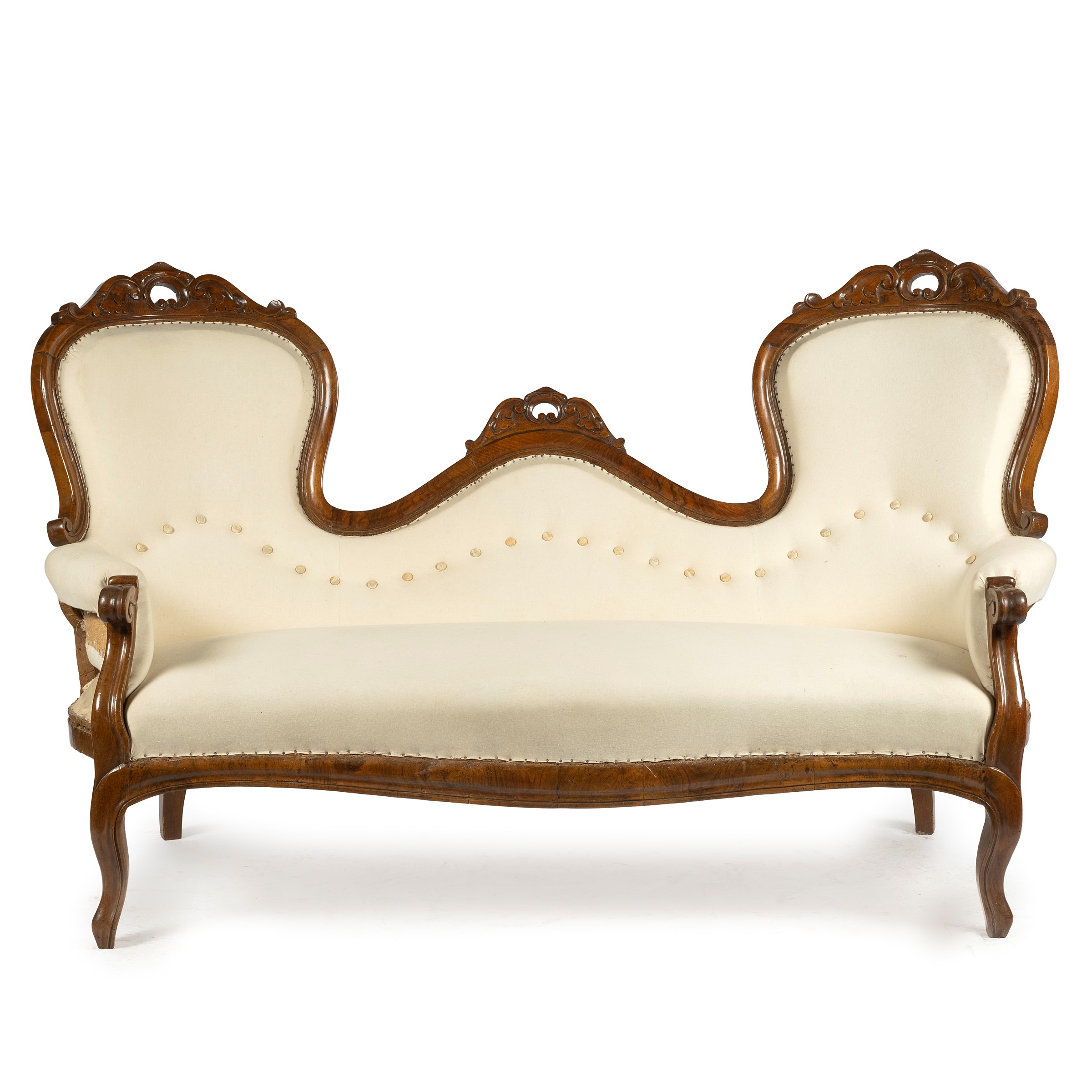 struttura in noce intagliato e sagomato ed imbottita, corredato di due cuscini, cm L180xP70xH110