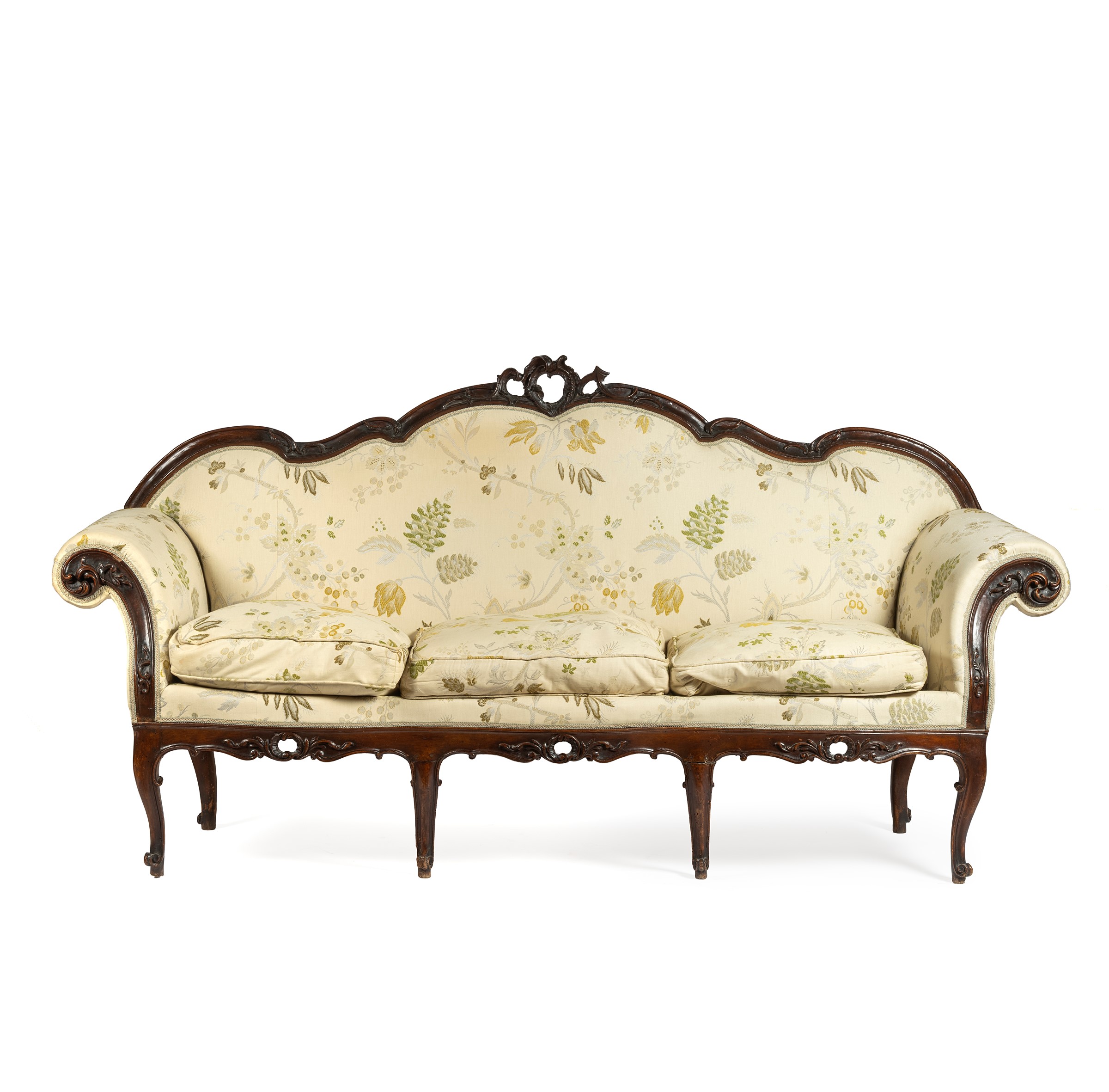 in noce sagomato ed intagliato, imbottito e rivestito in stoffa a fiori, cm L225xP63xH116