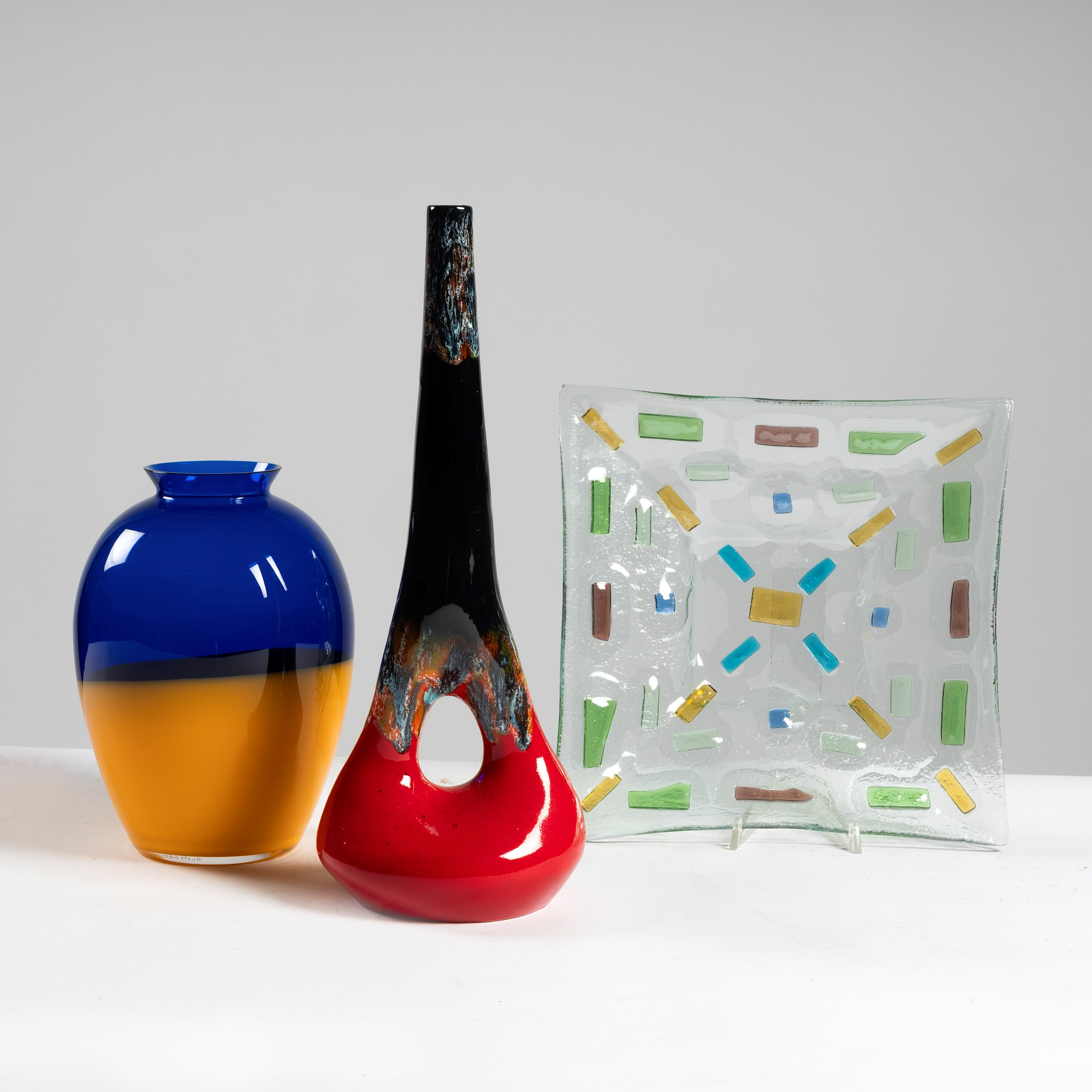 in vetro e maiolica, alt. cm 41 e alt. cm 25 piatto cm L28xP28xH5
