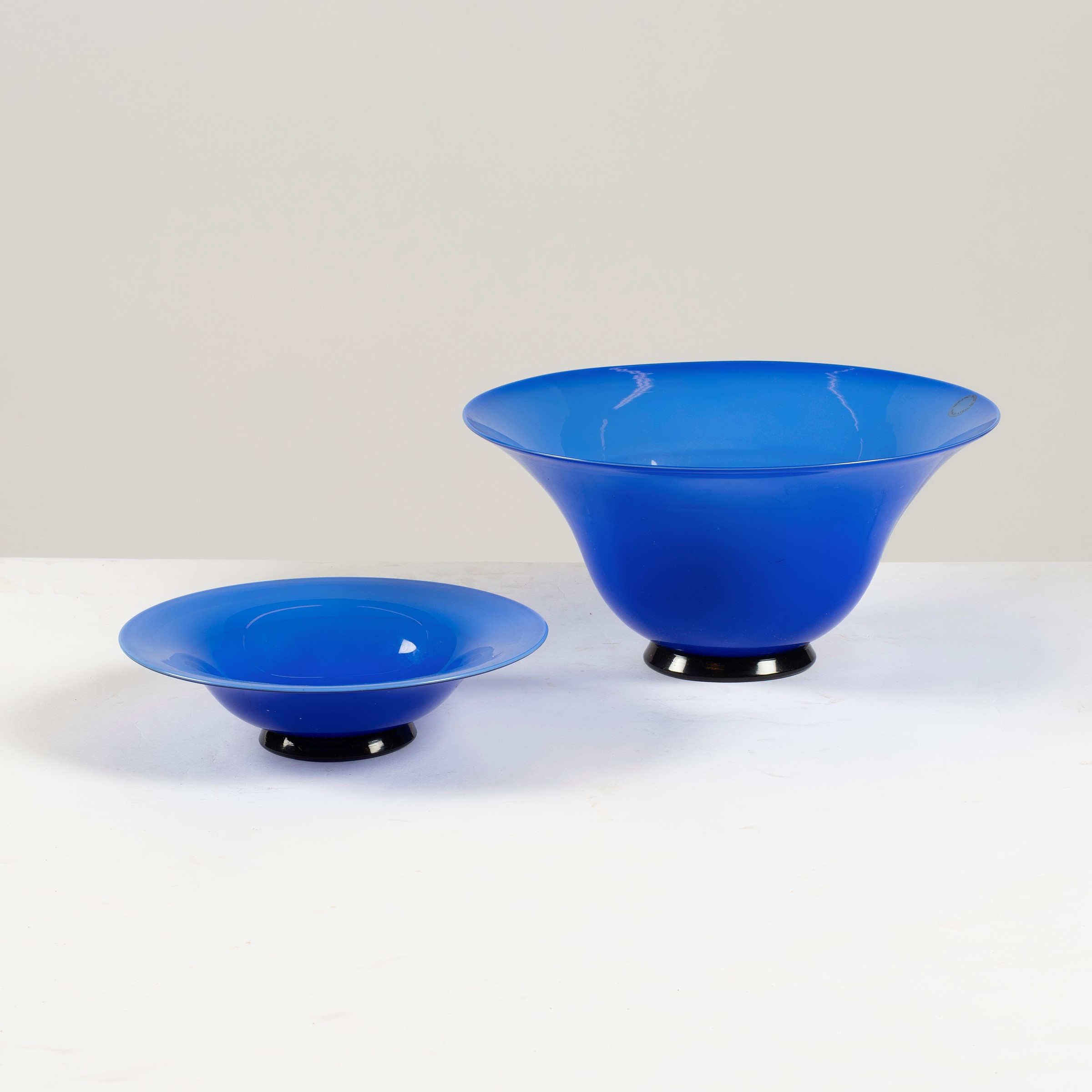 in vetro nei toni del blu, di forma circolare, firma Venini 90 a punta sul fondo, diam. cm 25 e cm 19