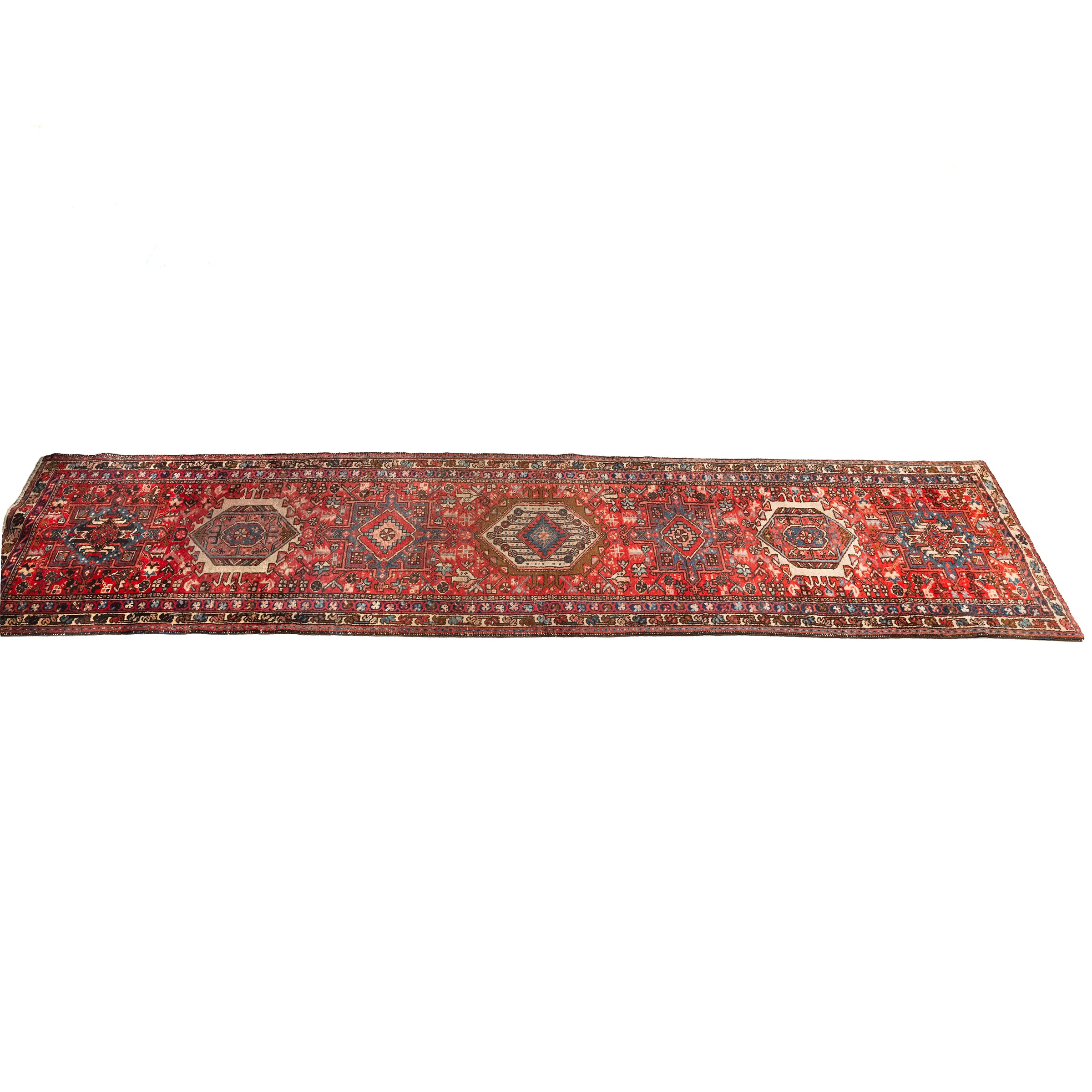 campo a motivo geometrico nei toni del rosso, del beige e dell'azzurro, cm 340x94