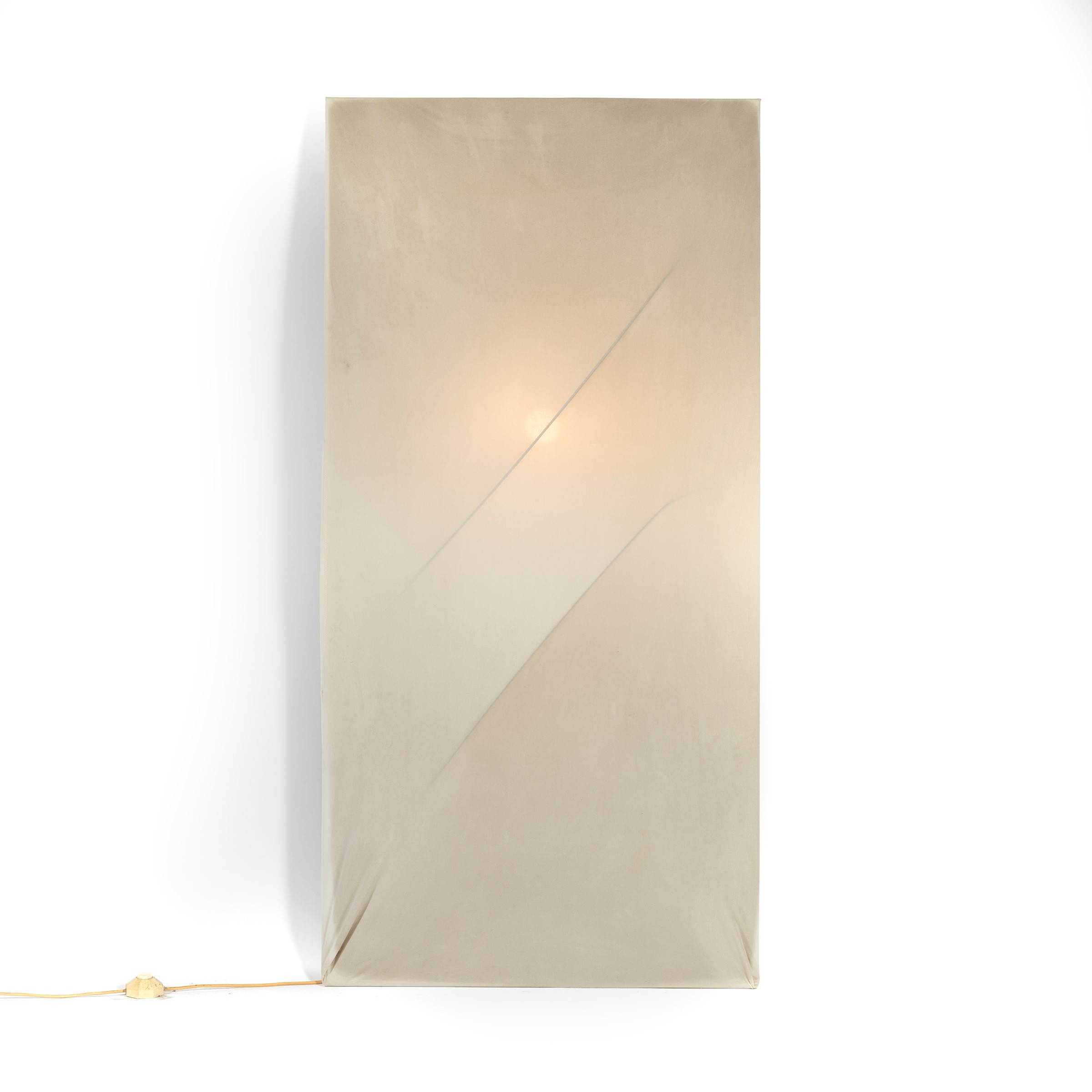 struttura in metallo, paralume in tessuto elasticizzato nei toni del bianco, cm L72xP30xH147