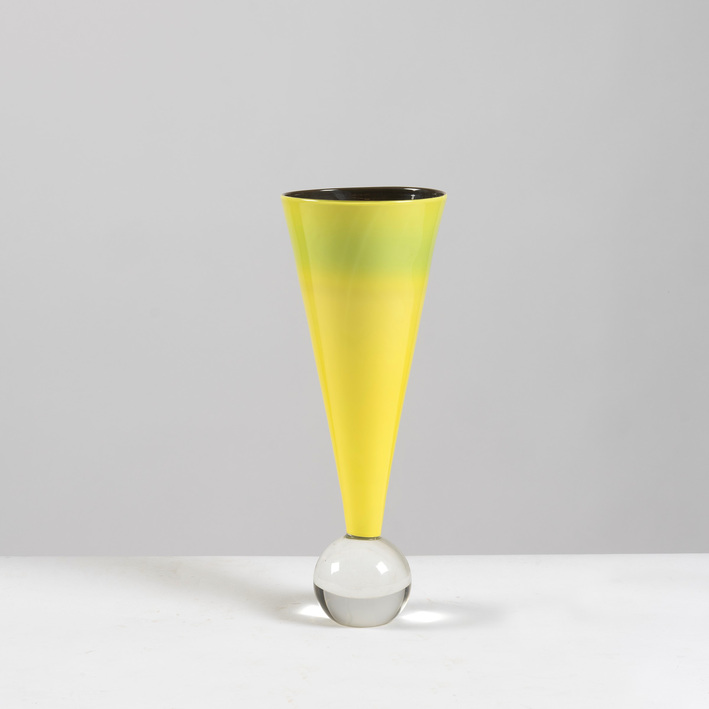in vetro opalino bicolore giallo e grigio, con base a sfera incolore, firma, produzione e data sotto la base e adesivo del produttore, diam. cm 13,5 e alt. cm 36