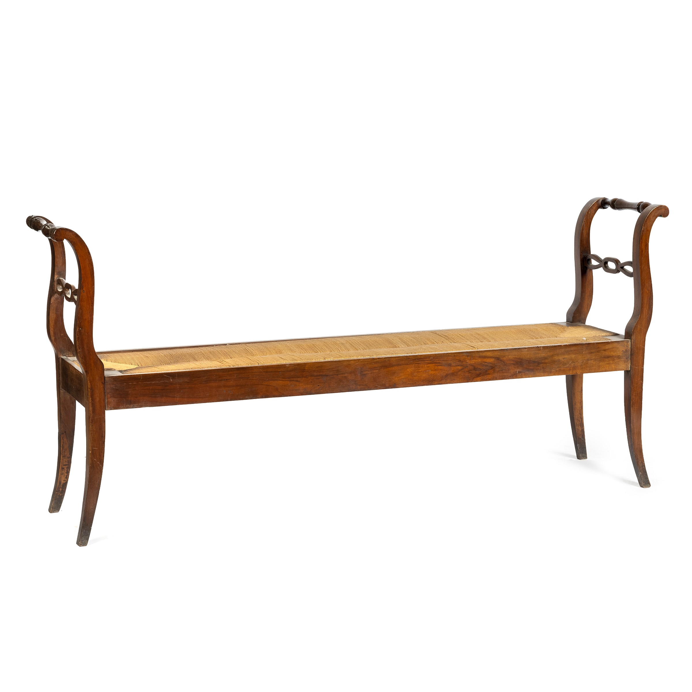 in noce da parete, laterali sagomati, seduta impagliata, cm L188xP40xH86