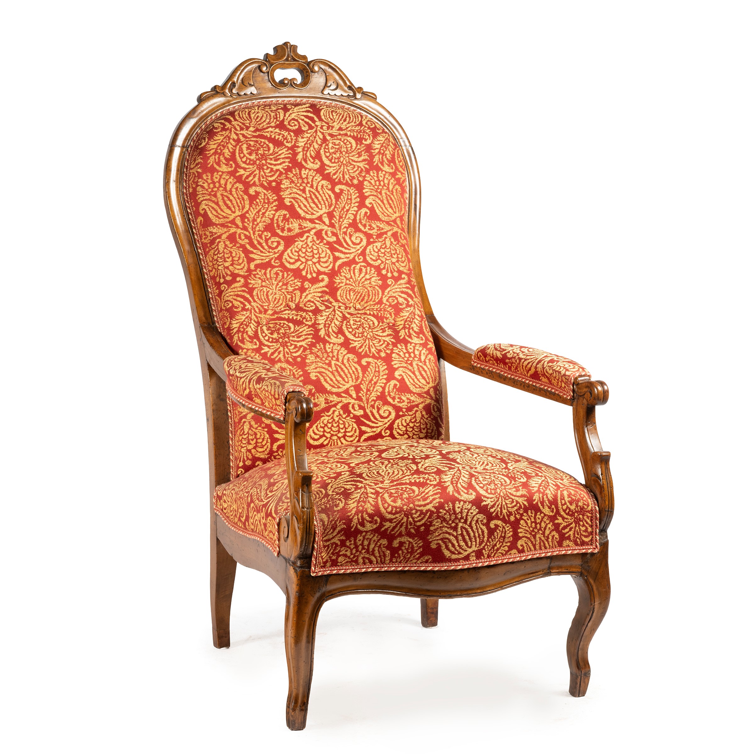 struttura in noce sagomata e intagliata, imbottita e rivestita in stoffa nei toni del rosso e dell'oro, cm L65xP90xH118