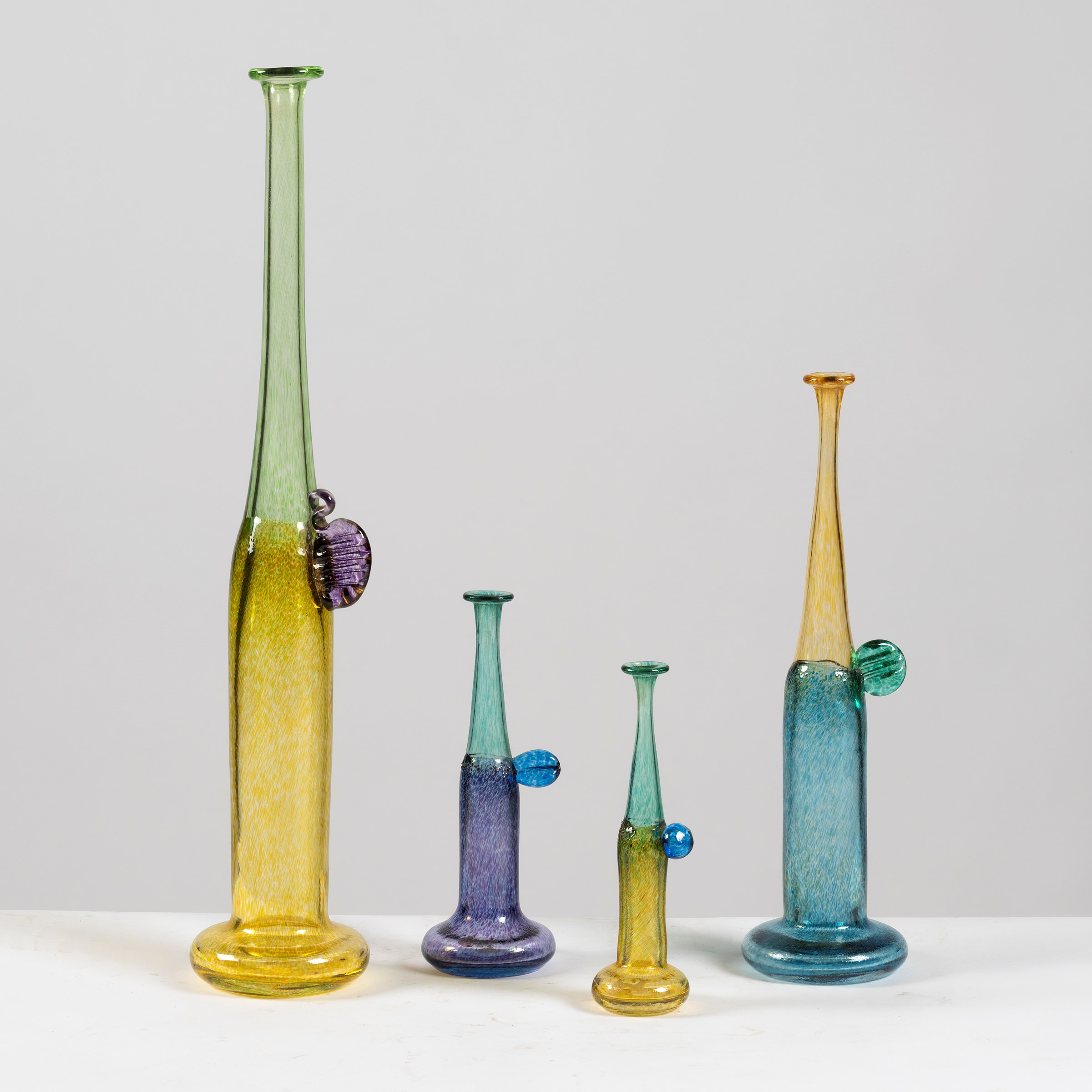 in vetro decorato nei toni del giallo, del viola e del verde, con piccoli manici, alt. da cm 18 a cm 47