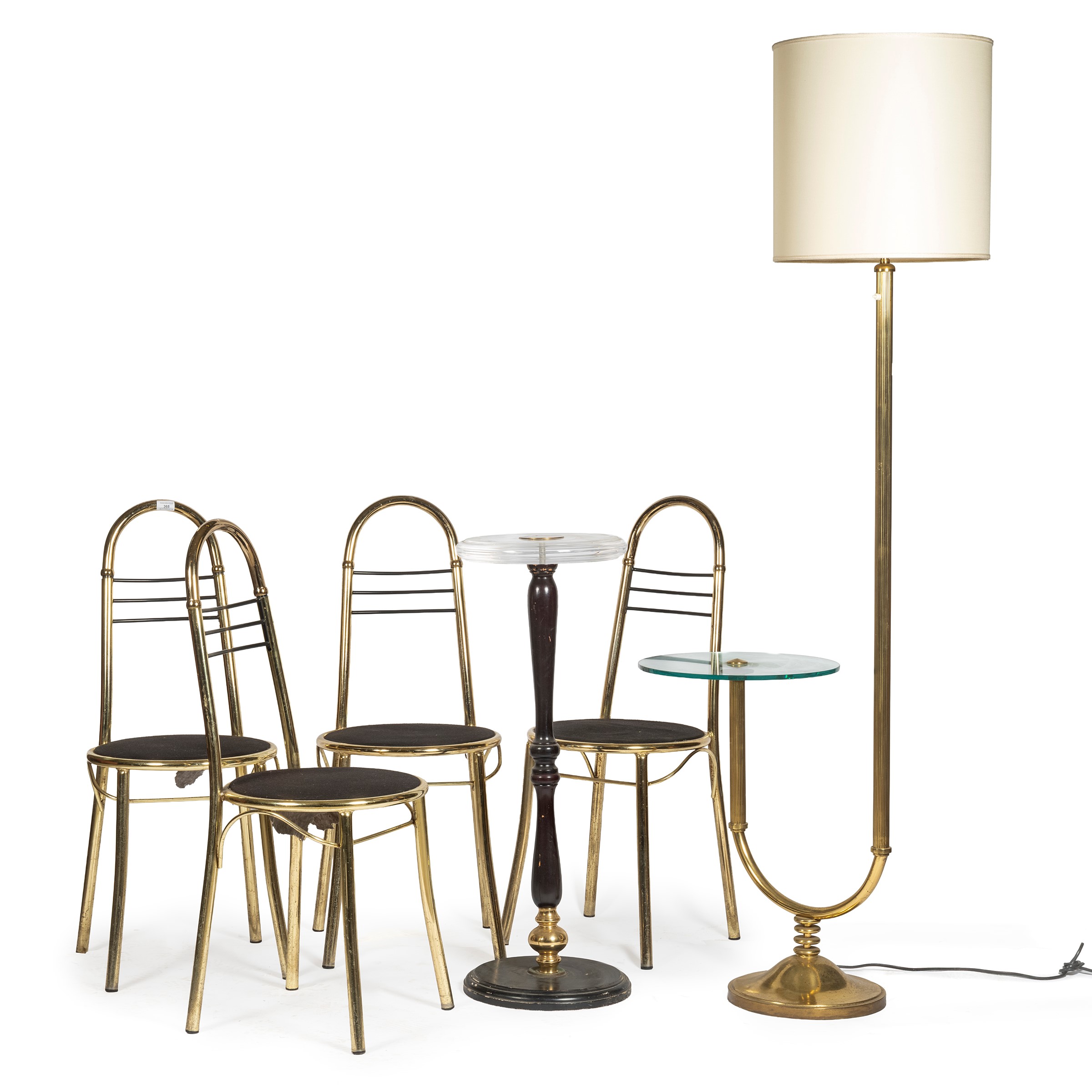 in ottone, base circolare, fusto scanalato con tavolino circolare in vetro, largh. cm 58 alt. cm 146