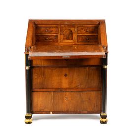 lastronata in noce, fronte a tre cassetti tra colonne ebanizzate, ribalta celante due coppie di tiretti sovrapposti centrati da piccolo sportello, cm L90xP57xH111