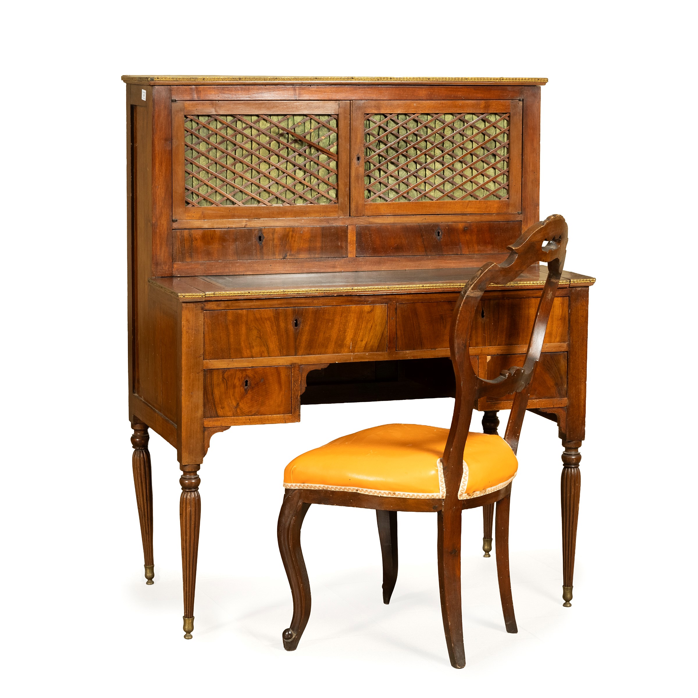 in noce, a due sportelli e sei cassetti, piano scorrevole, gambe scanalate; cm L100xP57xH124