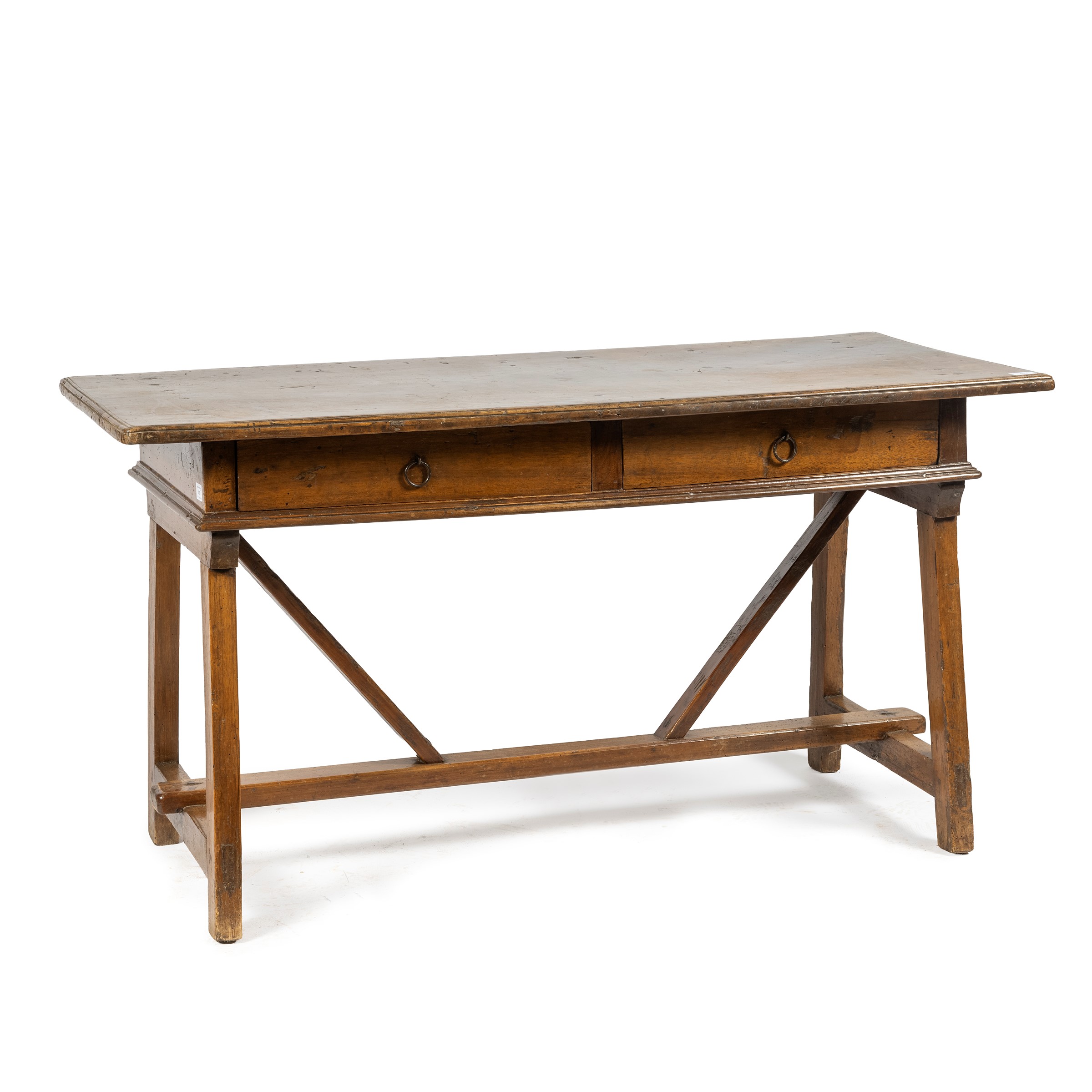 in noce con due cassetti, gambe a capra, cm L141xP63xH77