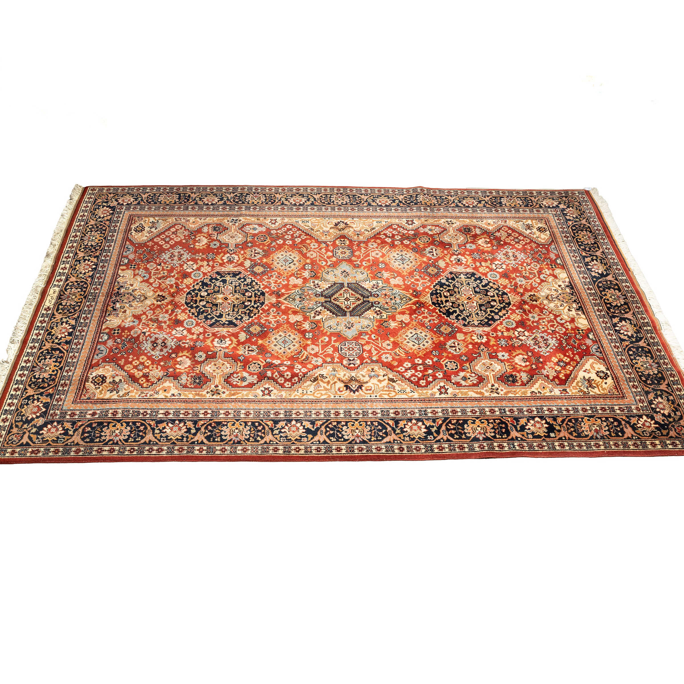 fondo rosso, campo a motivo geometrico con fiori stilizzati, con medaglione e bordura nei toni del blu, del beige, del verde e dell'azzurro, cm 307x200