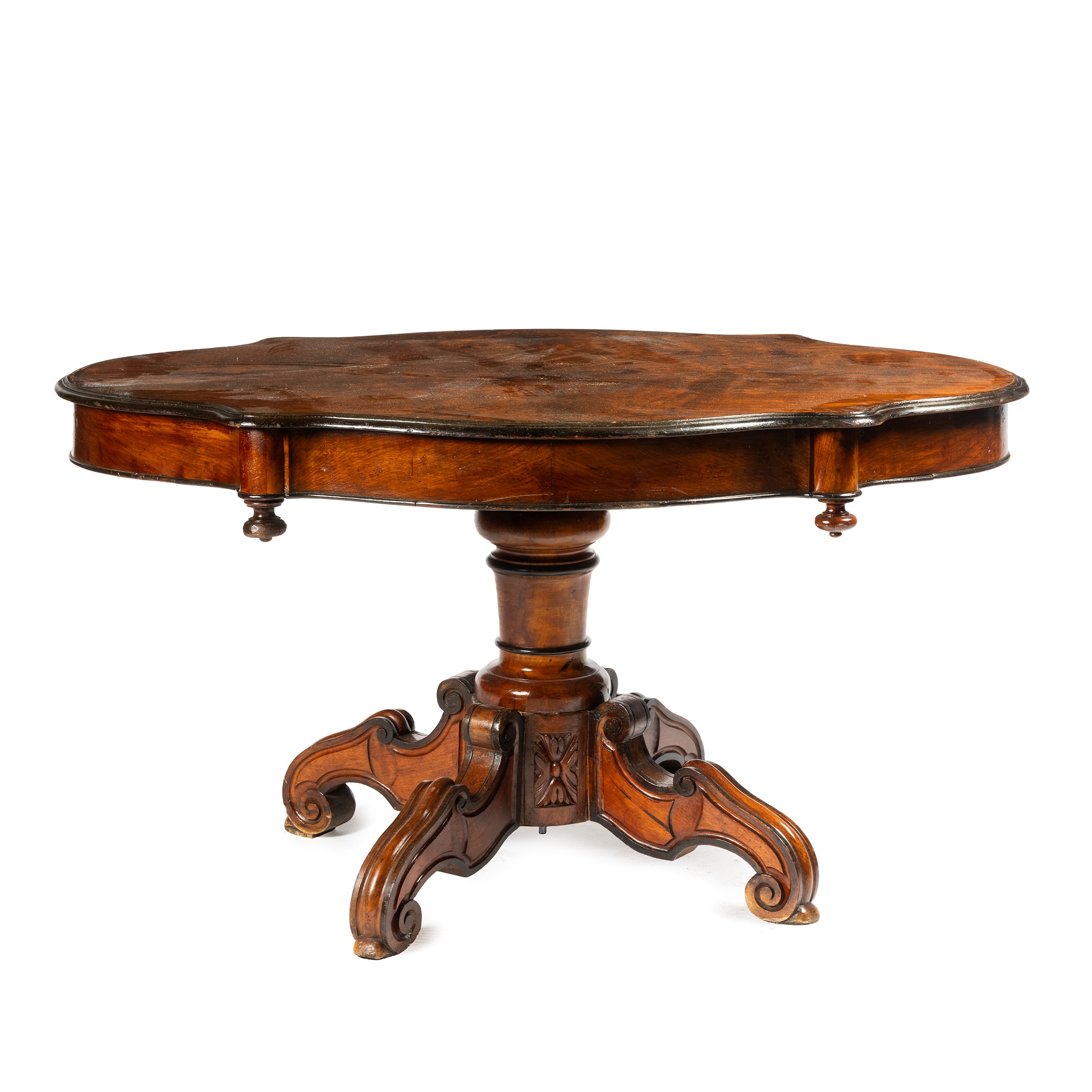 in noce, con piano sagomato, fusto centrale tornito su quattro piedi mossi, cm L132xP97xH70