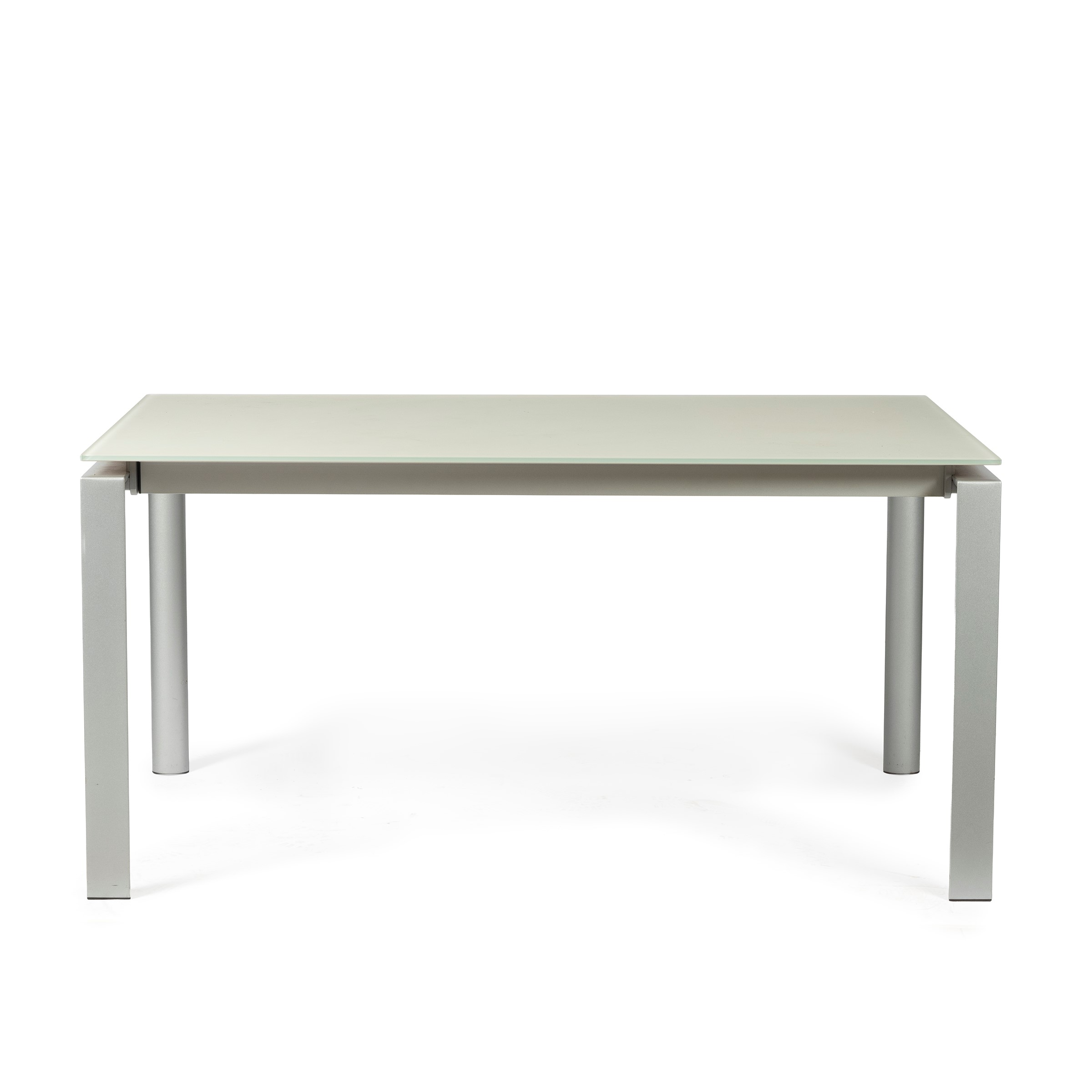 gambe in acciaio e piano in vetro satinato, due prolunghe all'interno, cm L145xP85xH73,5