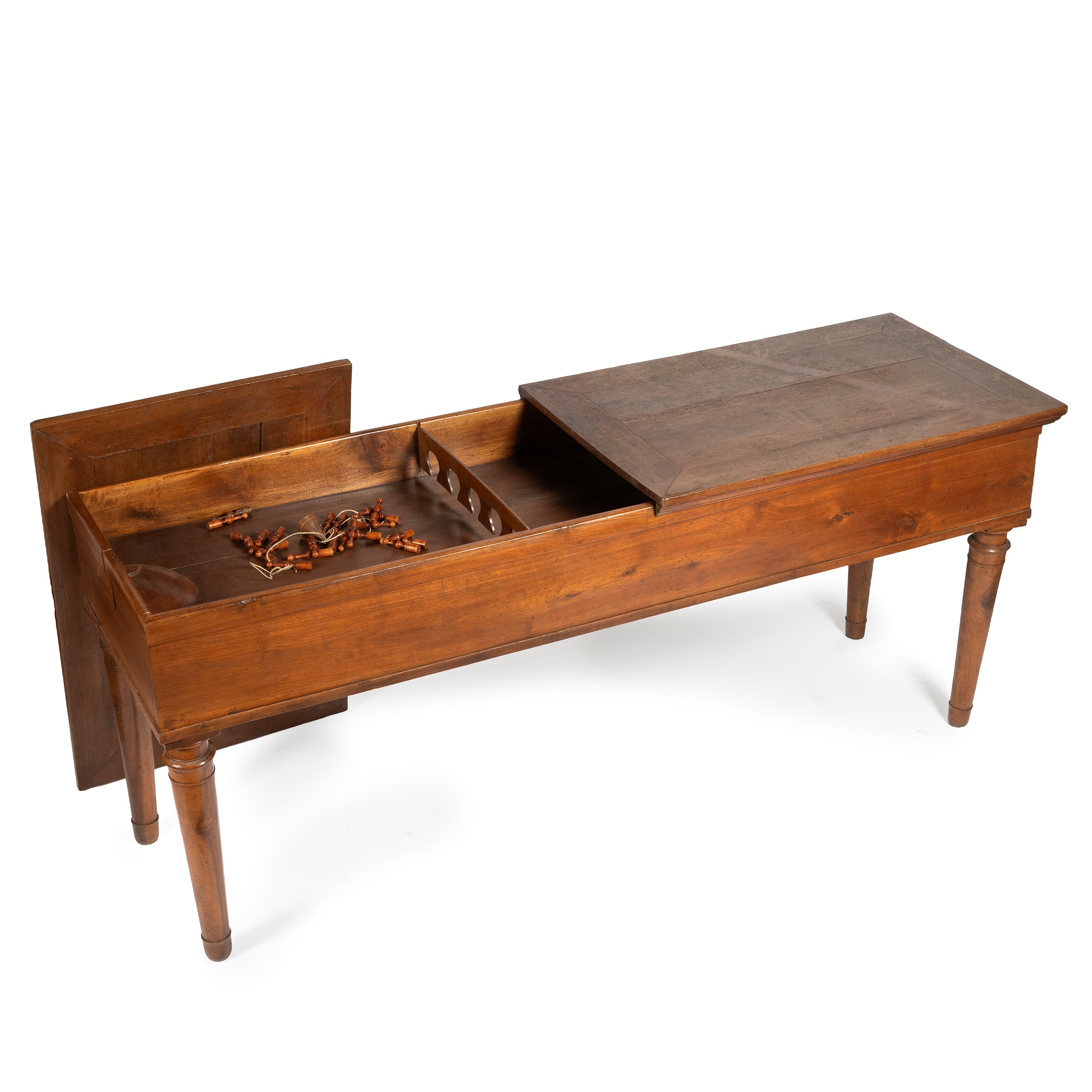 in noce con gambe tornite e piano in due elementi, cm L198,5xP64xH83,5