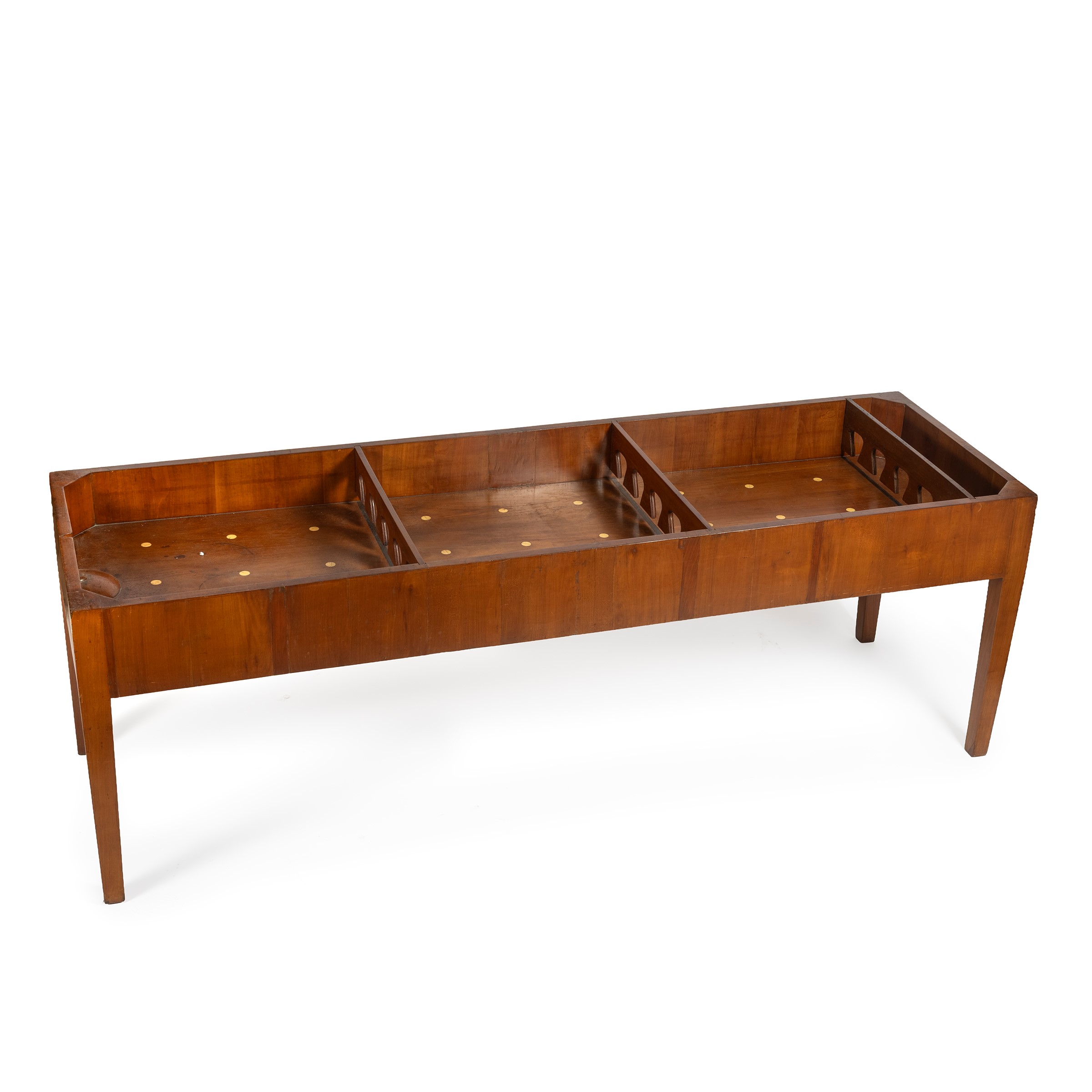 in noce, con all'interno fascie traforate, completo di birilli e filo, cm L217xP69xH73