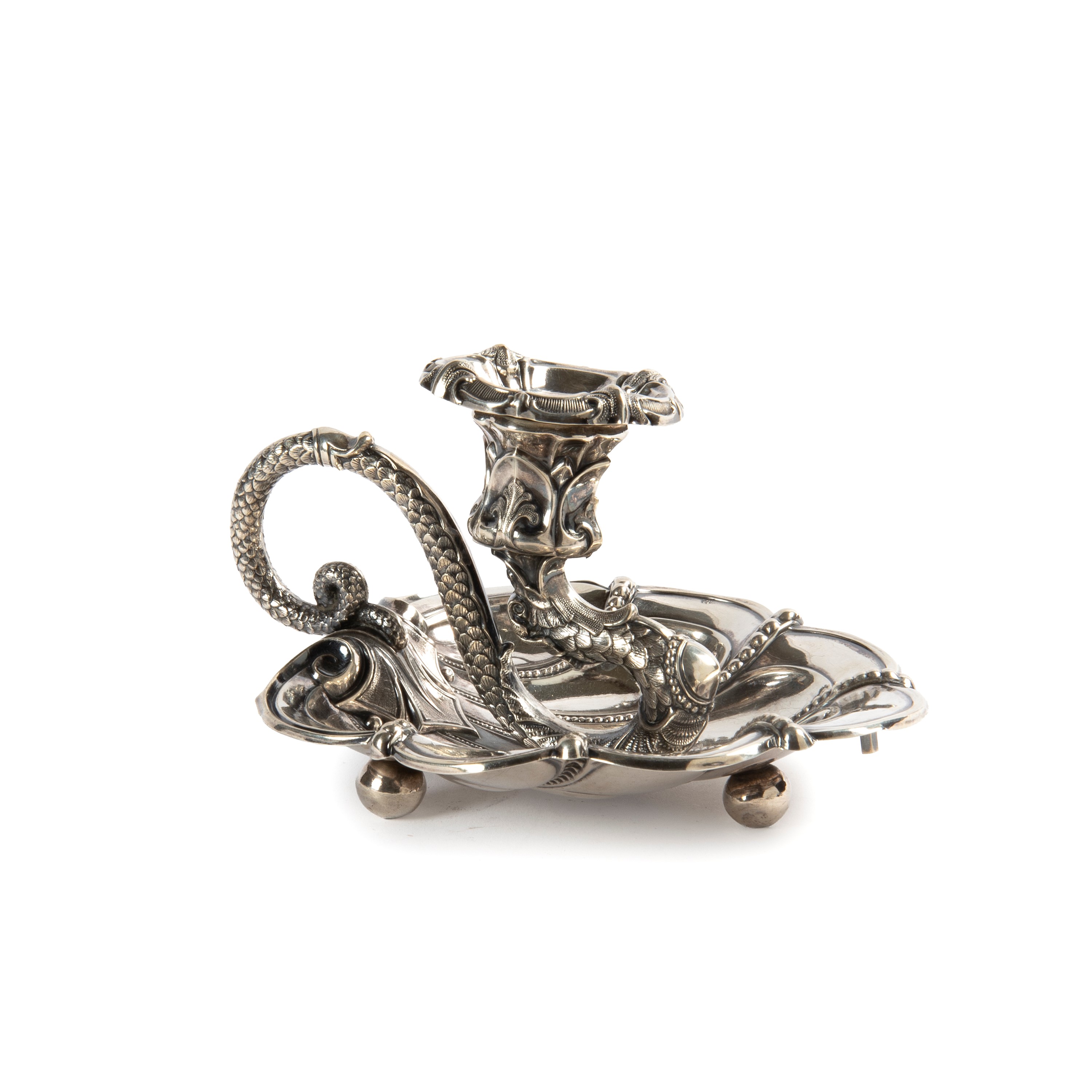 in argento a forma di conchiglia, impugnatura e sostegno della bobeque a forma di drago, cm 10x16
