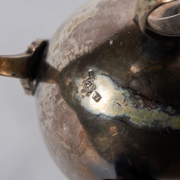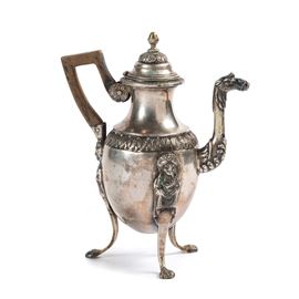 in argento, a tre sostegni con attaccatura a figure femminili, finali a zampe ferine, manico in legno alt.cm 20, g 420