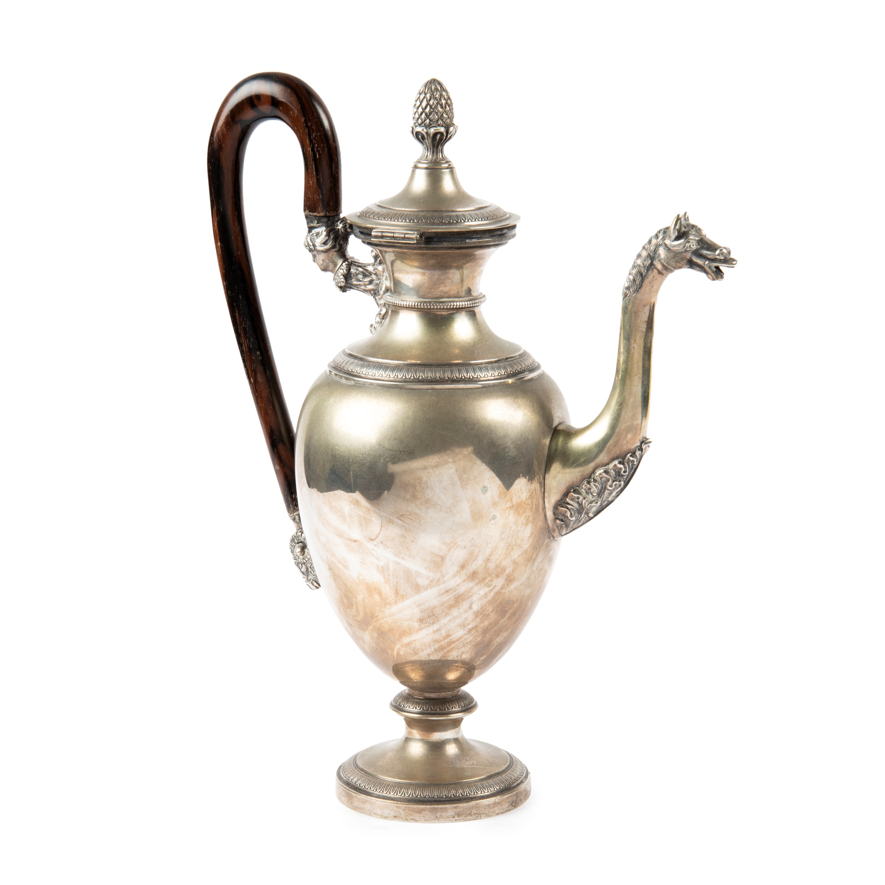in argento, stile impero, corpo piriforme, beccuccio con finale a testa di cavallo, manico in legno a voluta, alt. cm 36 g 1250, punzone 800