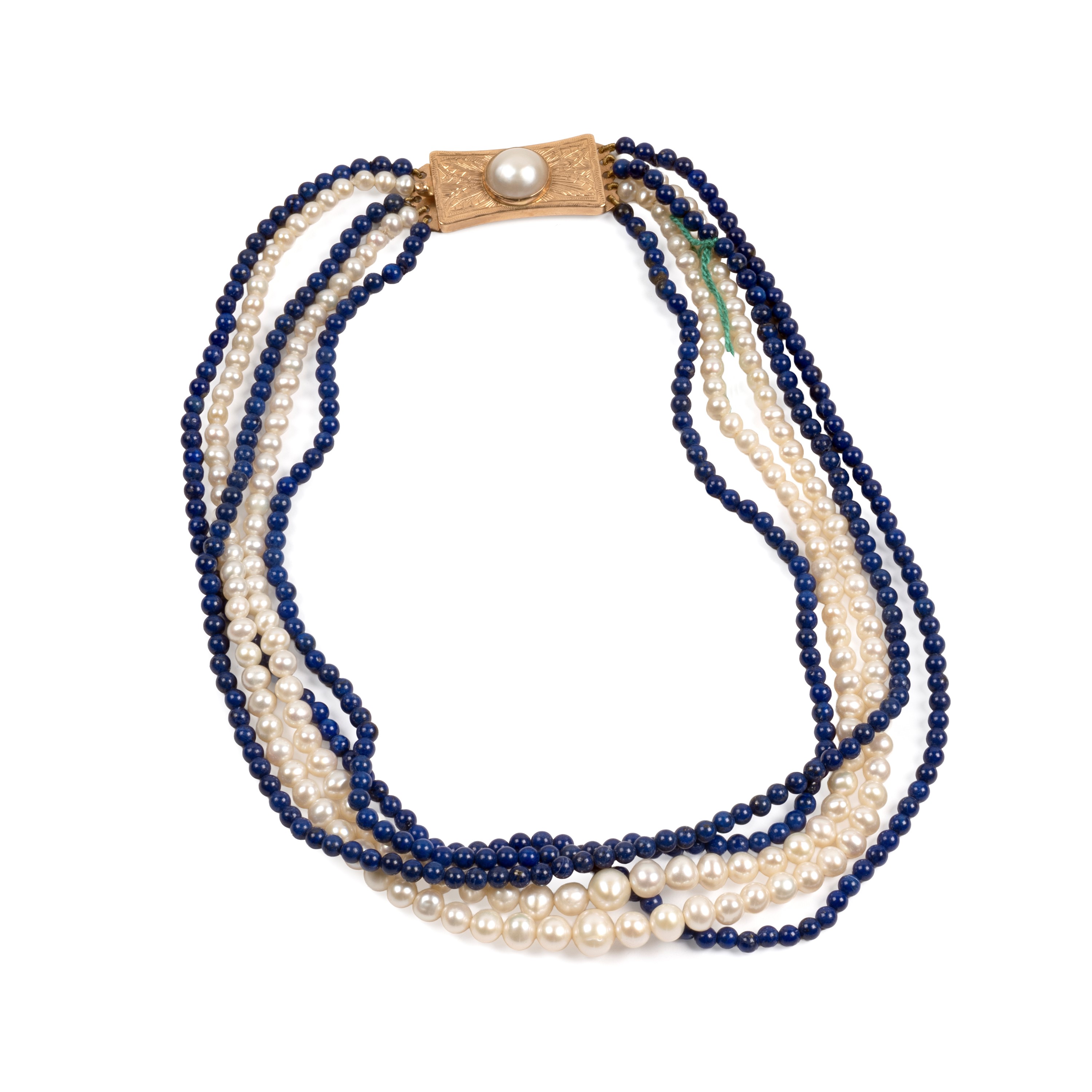 COLLANA A CINQUE FILI DI PERLE DI FIUME E AGATA BLU'