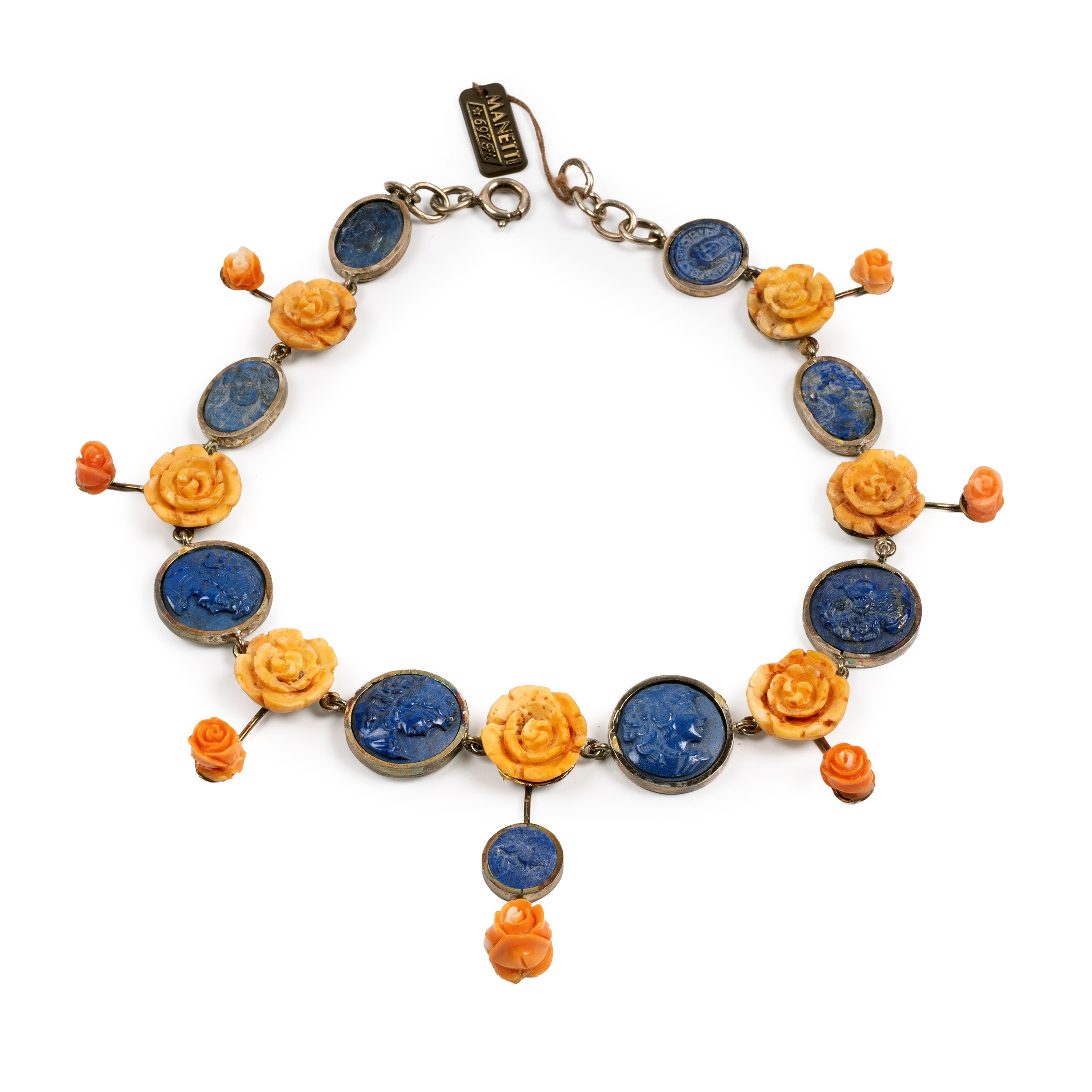 decorata con rose di corallo e cammei di lapislazzuli, lungh. cm 41