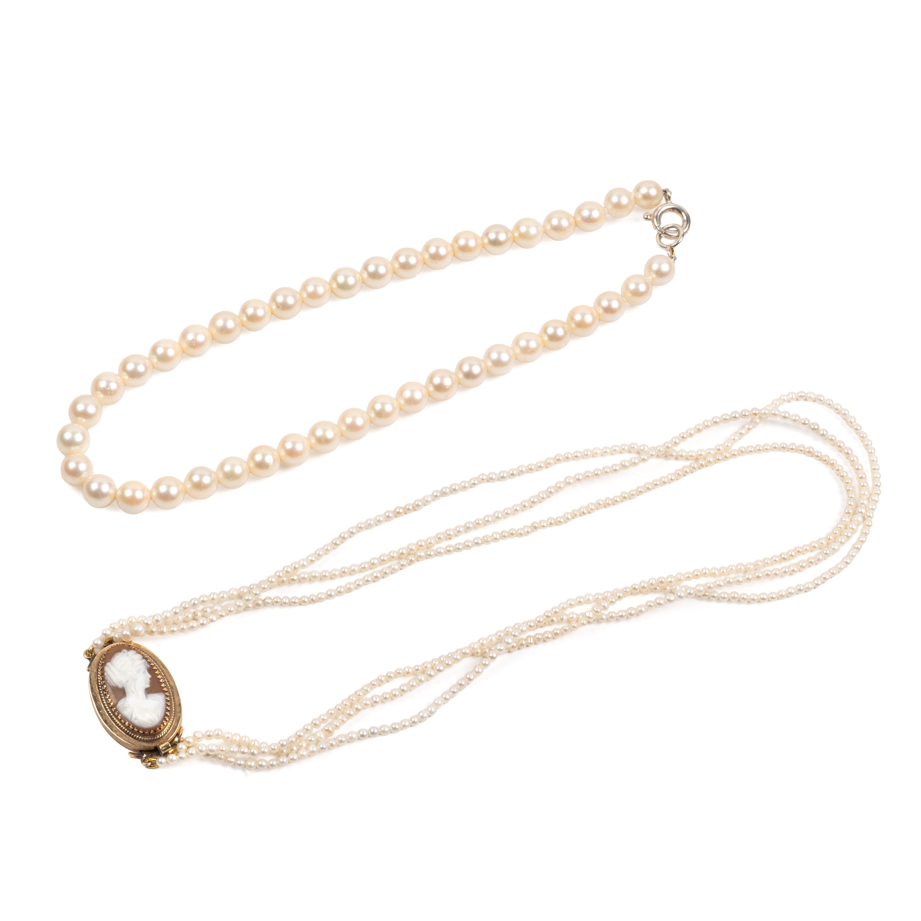 realizzata a tre fili con fermatura in oro e decorata con cammeo lungh. cm 42