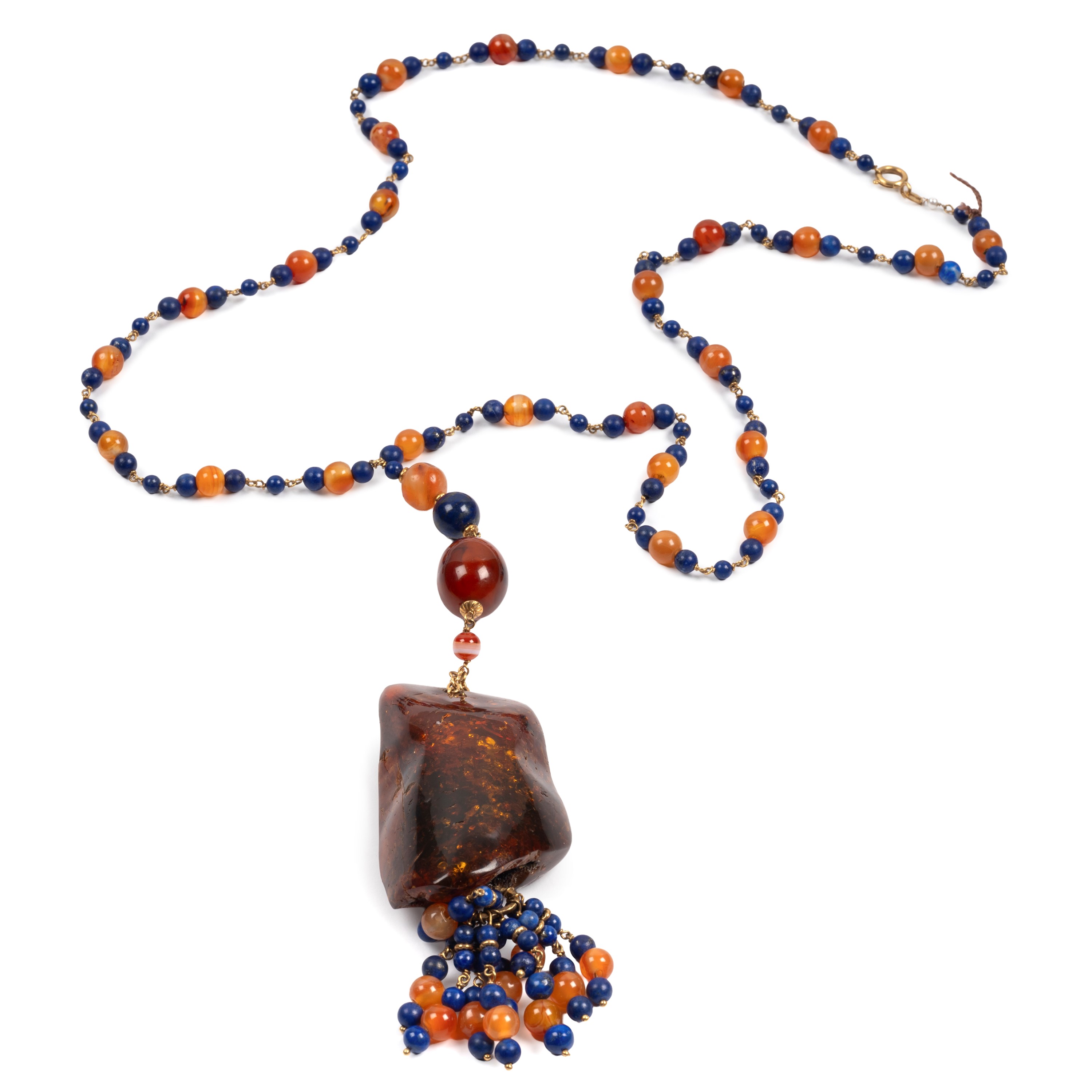 realizzata ad un filo di piccole sfere di corniola e lapislazzuli, finale con grande pezzo di ambra lungh. cm 51, chiusura a moschettone in oro, punzone 750