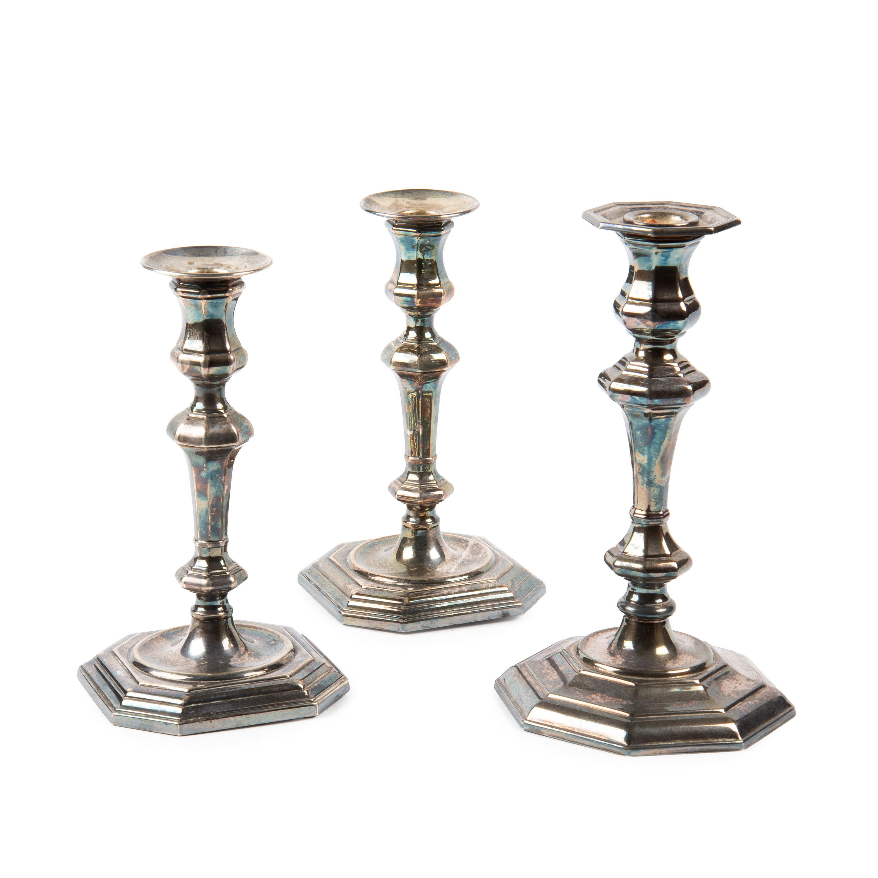 in argento, fusto a balaustro, base ottagonale, alt. cm 19,5, basi appesantite, complessivi g 660 lordi