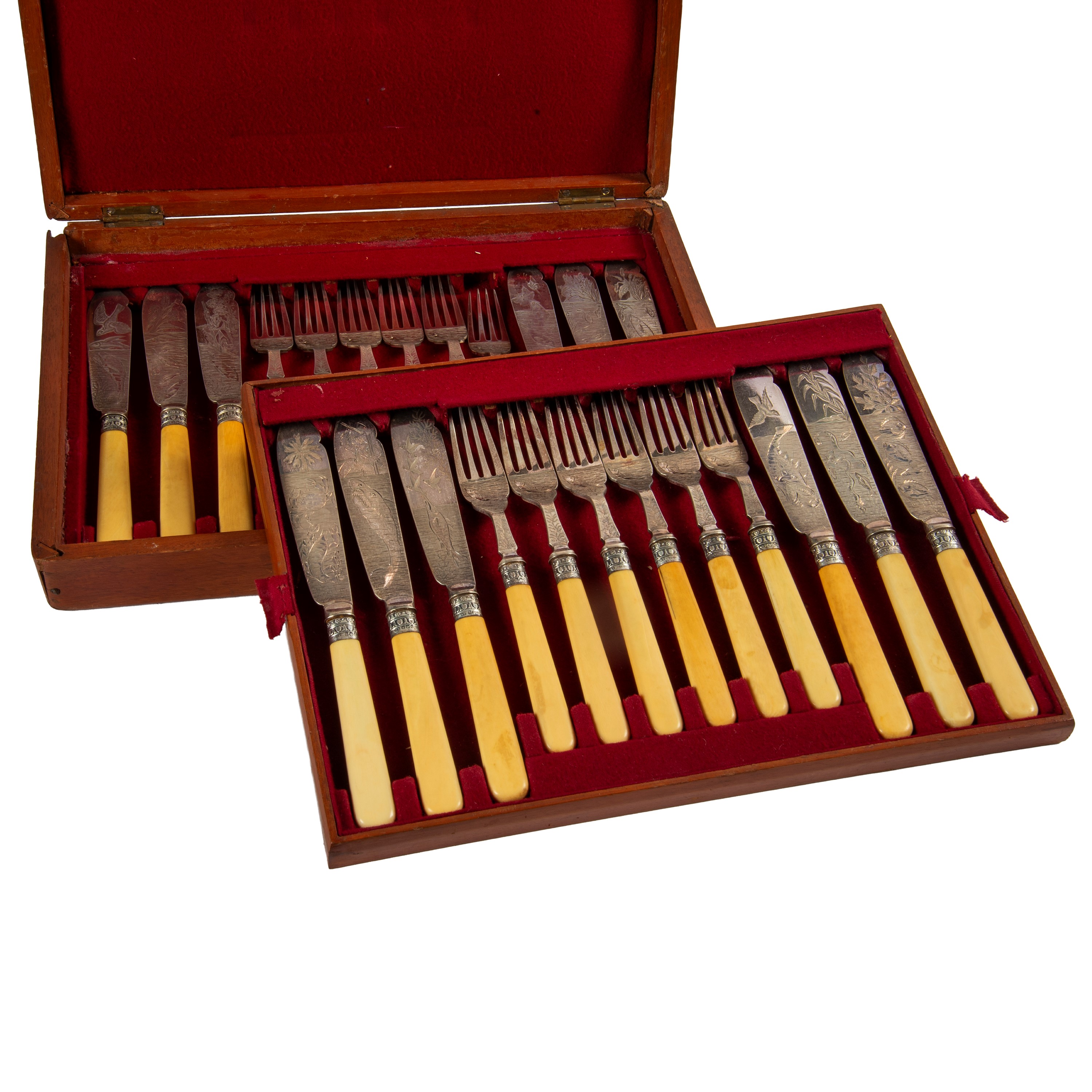 in metallo argentato inciso a pesci, manici in osso, entro scatola