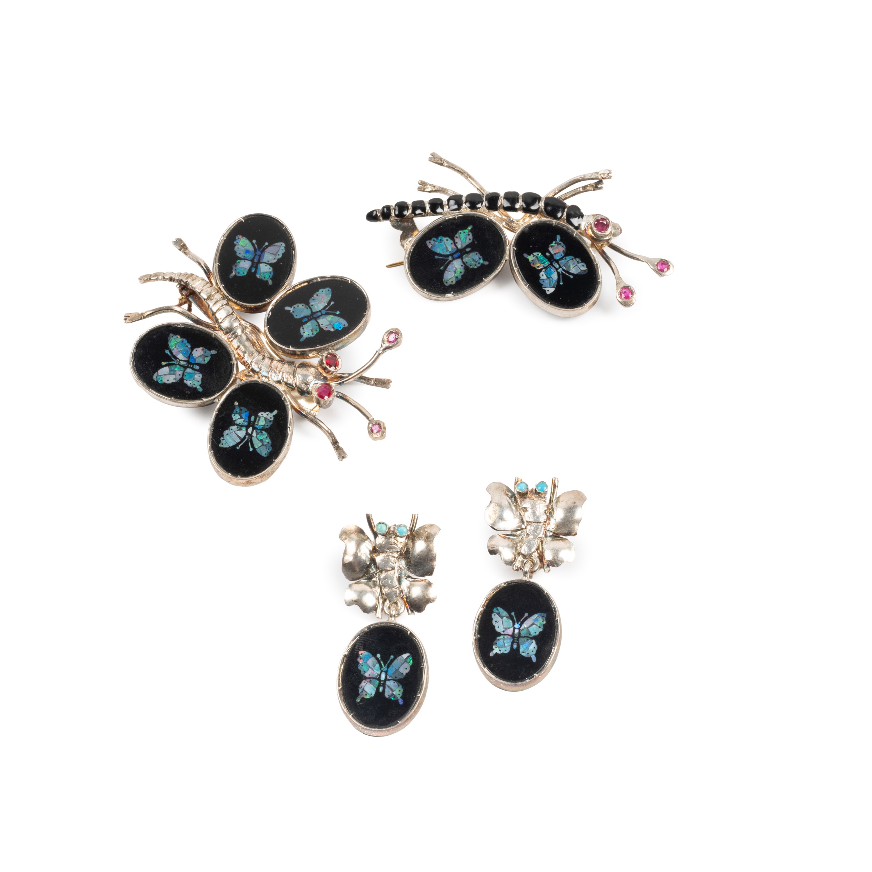 realizzate a forma di libellula con ali in onice ovali e decorate a mosaico di varie pietre, sei piccoli rubini, cm 8,6X6 e 8X4, spillo in oro giallo 18kt