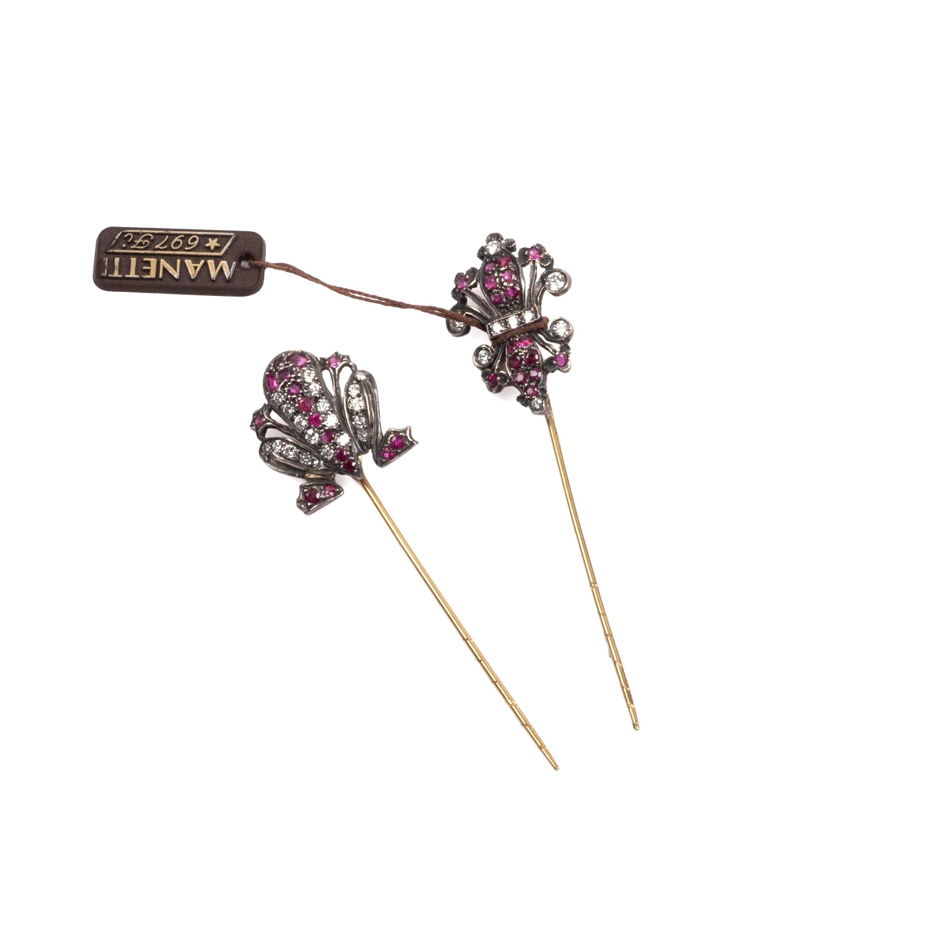 DUE SPILLI IN ORO 18KT, ARGENTO, DIAMANTI E RUBINI